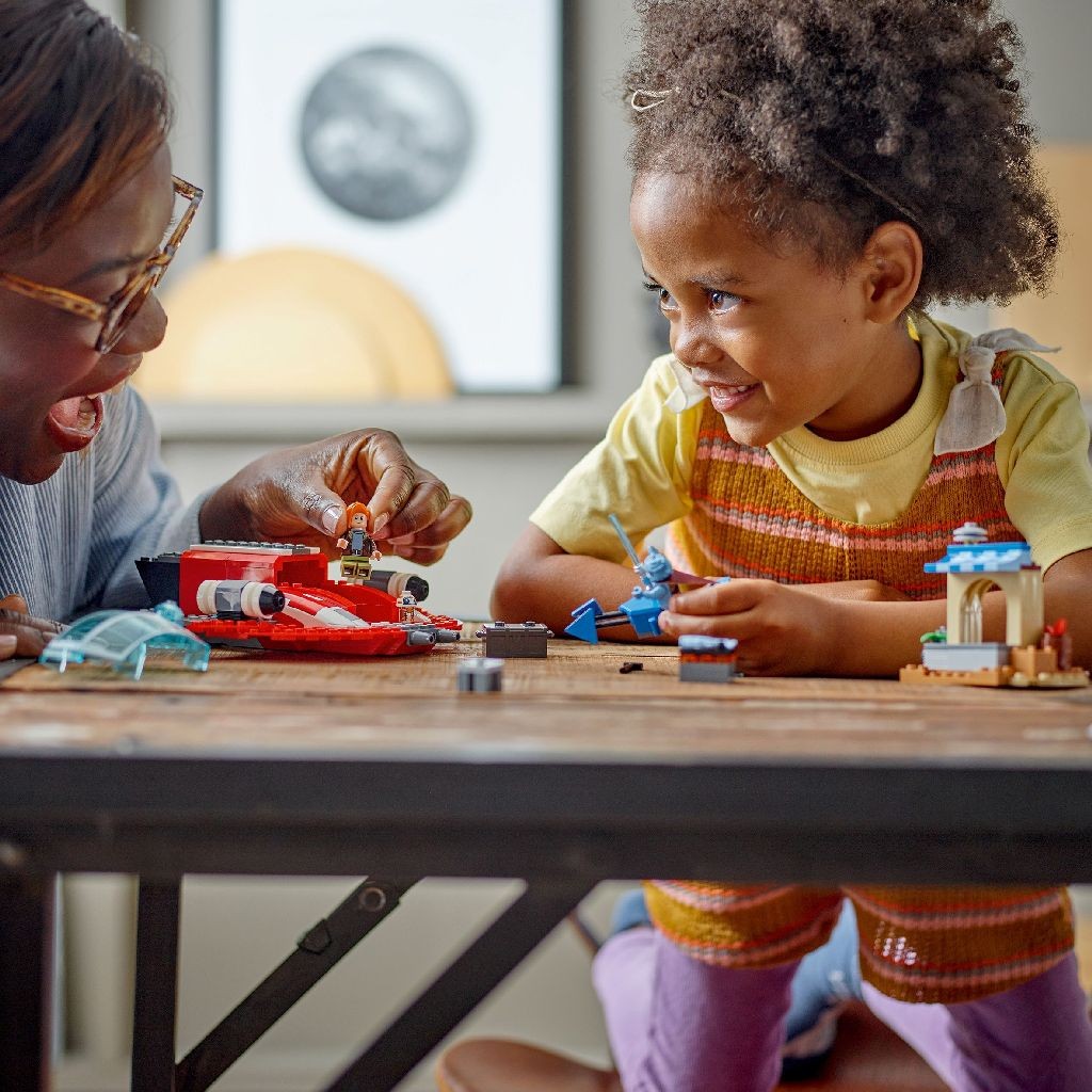 Modelul include o baza pentru incepatori, usor de asamblat, care ii ajuta pe cei mici sa construiasca cu mai multa incredere. Carlinga are loc pentru personaje, iar motocicleta rapida poate fi depozitata in interiorul navei, pentru scenarii de joaca si mai captivante.