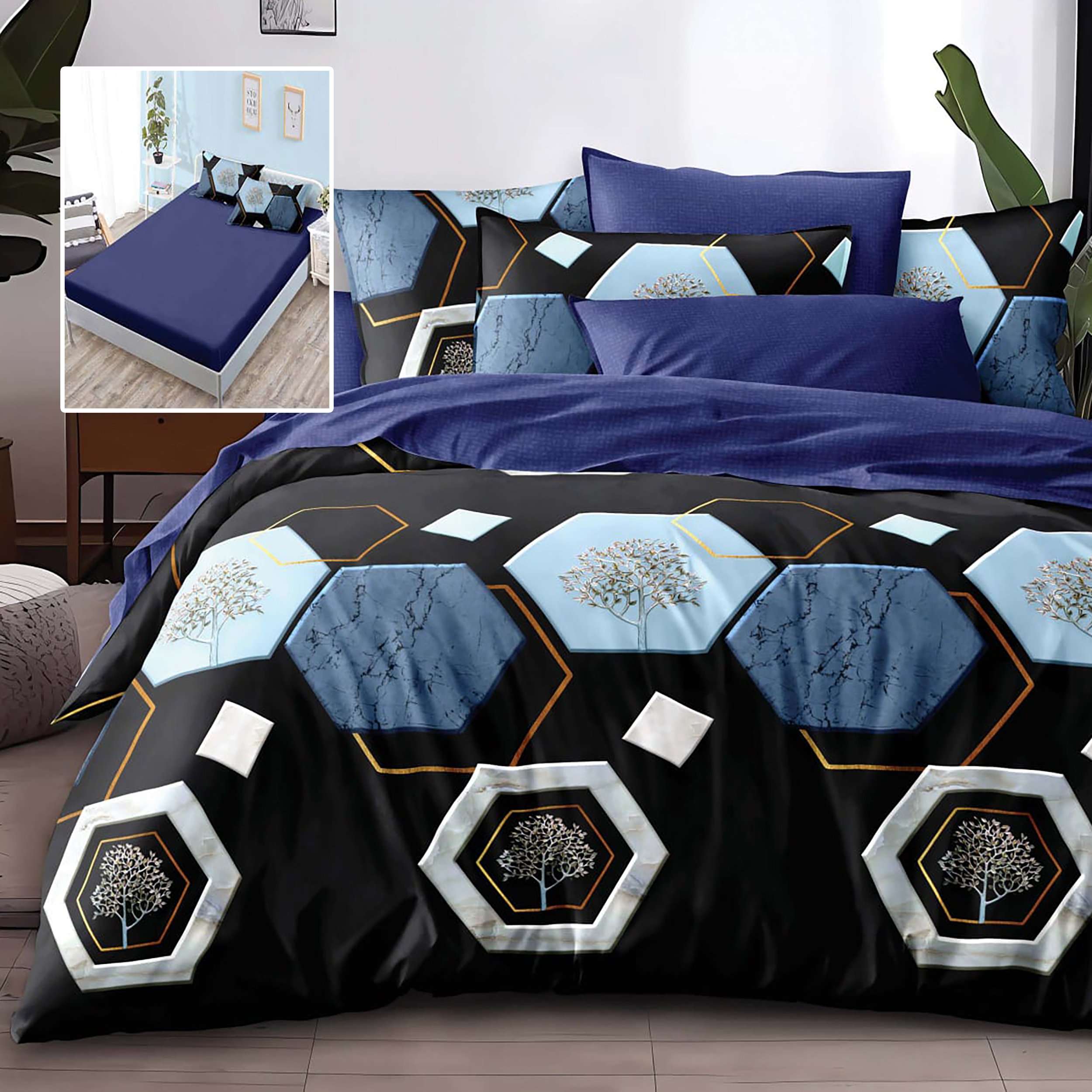 Lenjerie de pat finet 6 piese, cearceaf pat cu elastic, cearceaf pilota 200x230, 2 fete perna 50x70, 2 fete perna 70x70, Extra, Bleumarin Relax KipRoom