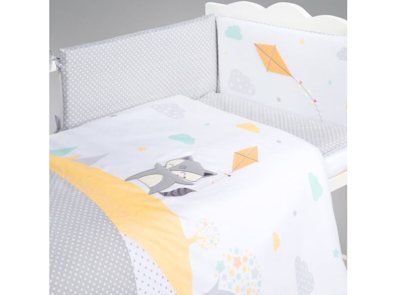 Ofera-i micutului un somn linistit cu aceasta lenjerie pat bebe 3 piese KLUPS Raccoon, realizata din bumbac 100%, placut la atingere si potrivit pentru pielea sensibila. Designul cu raton, in nuante calme de gri si galben, se potriveste perfect in camera copilului, iar materialele antialergice contribuie la un plus de confort zi de zi.