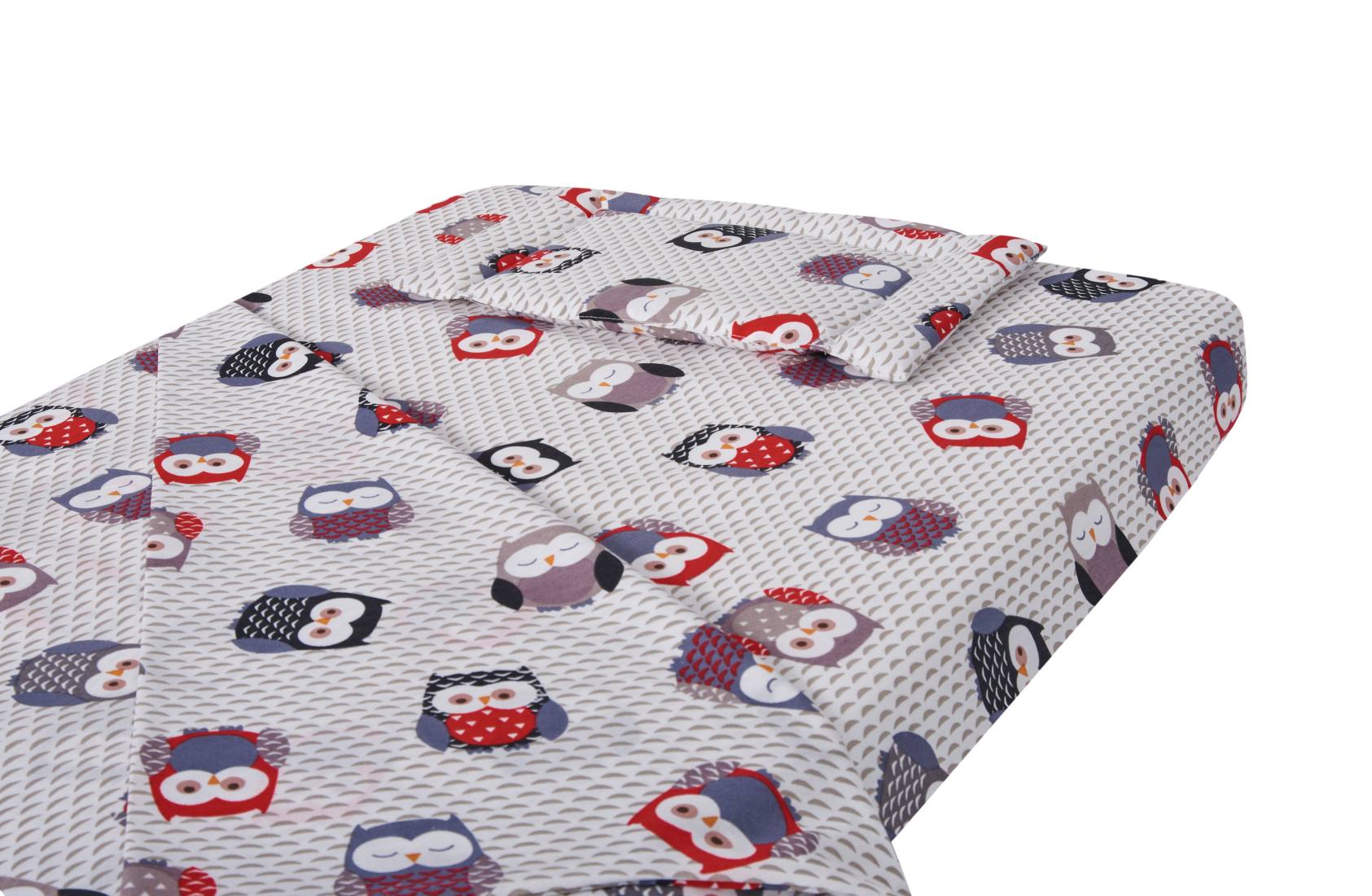 Ofera-i celui mic un somn linistit cu aceasta lenjerie pentru patut bebe SomnArt, realizata din 100% bumbac, placut la atingere si prietenos cu pielea sensibila. Setul include cearceaf cu elastic, pilota usoara si pernuta joasa, fiind alegerea potrivita pentru un patut de 60x120 cm. Modelul Bufnite Mici, in nuante de gri si rosu, adauga un aspect vesel si cald camerei copilului.