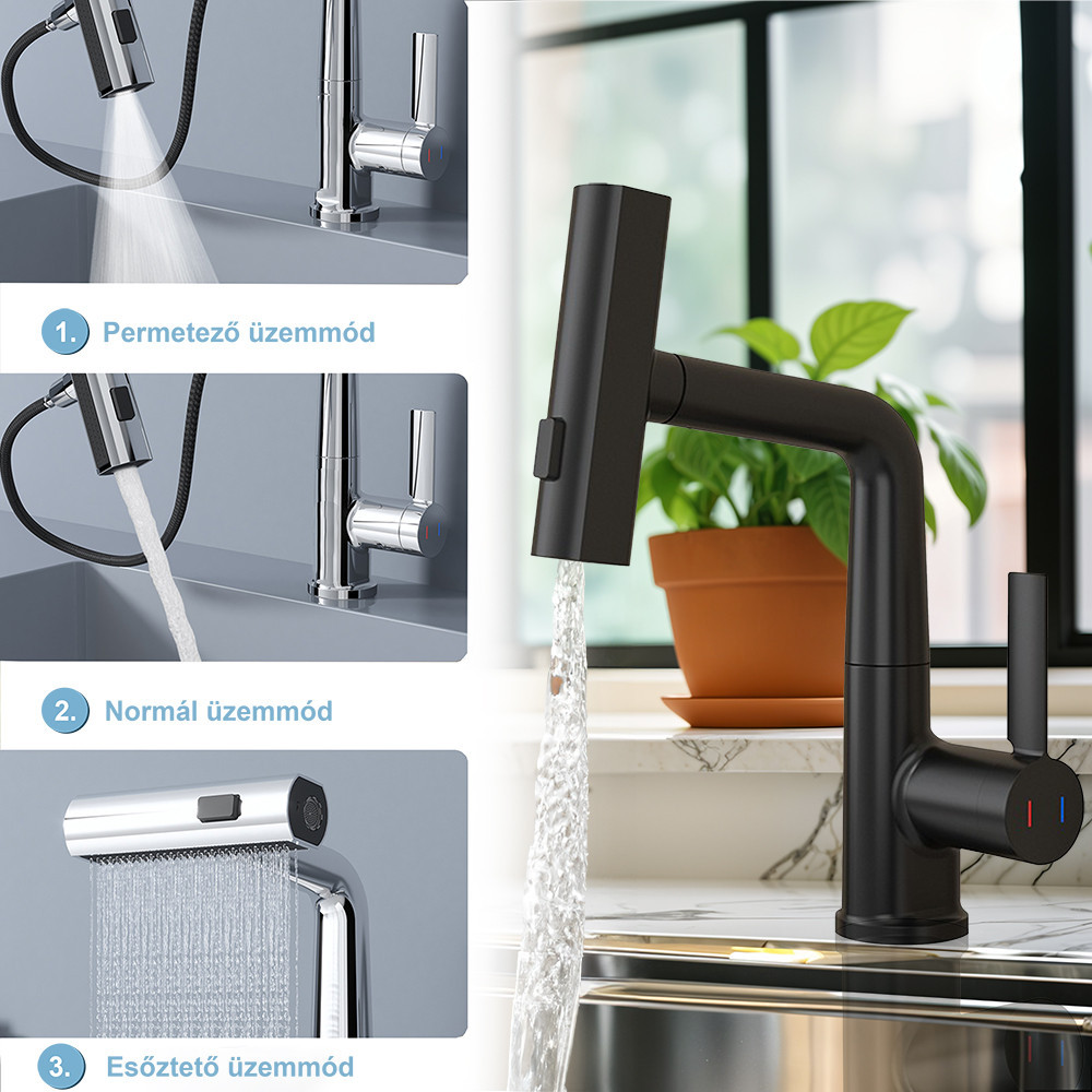Bateria Mara nu este doar o bijuterie a bucătăriilor moderne, ci se remarcă și prin soluțiile sale practice. Capul multifuncțional vă permite să finalizați diverse sarcini în bucătărie rapid și eficient, în timp ce designul rotativ și extensibil la 360° oferă flexibilitate maximă.