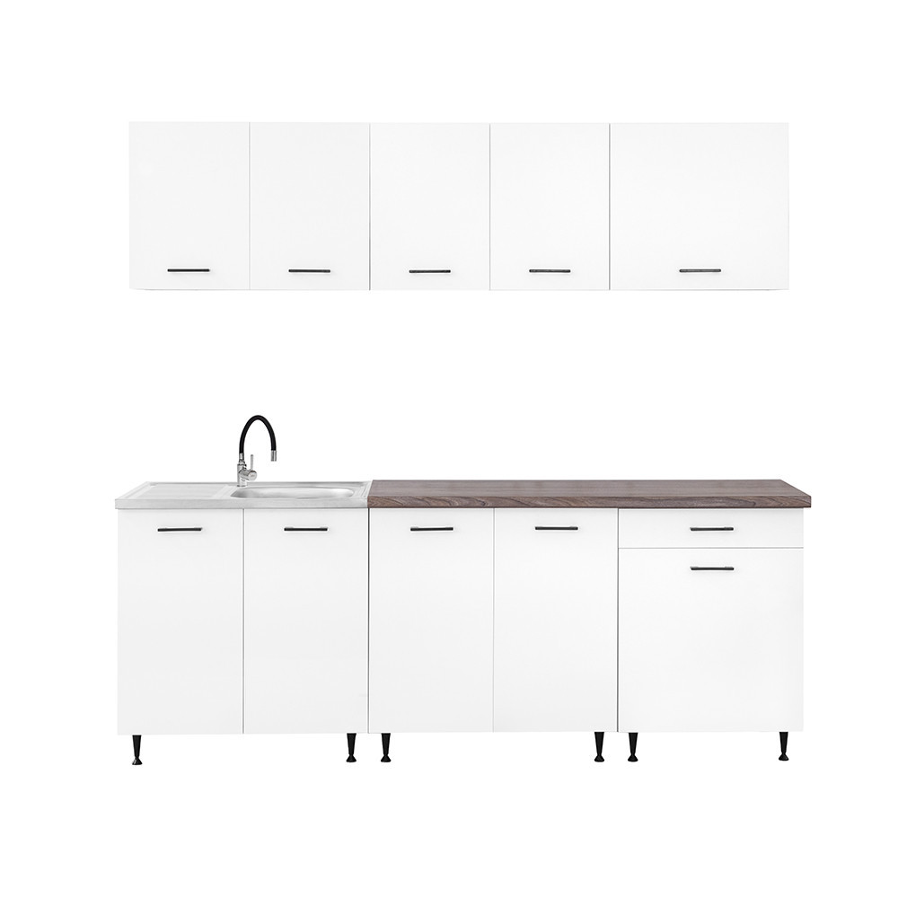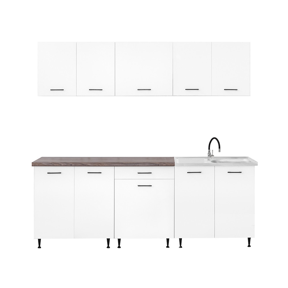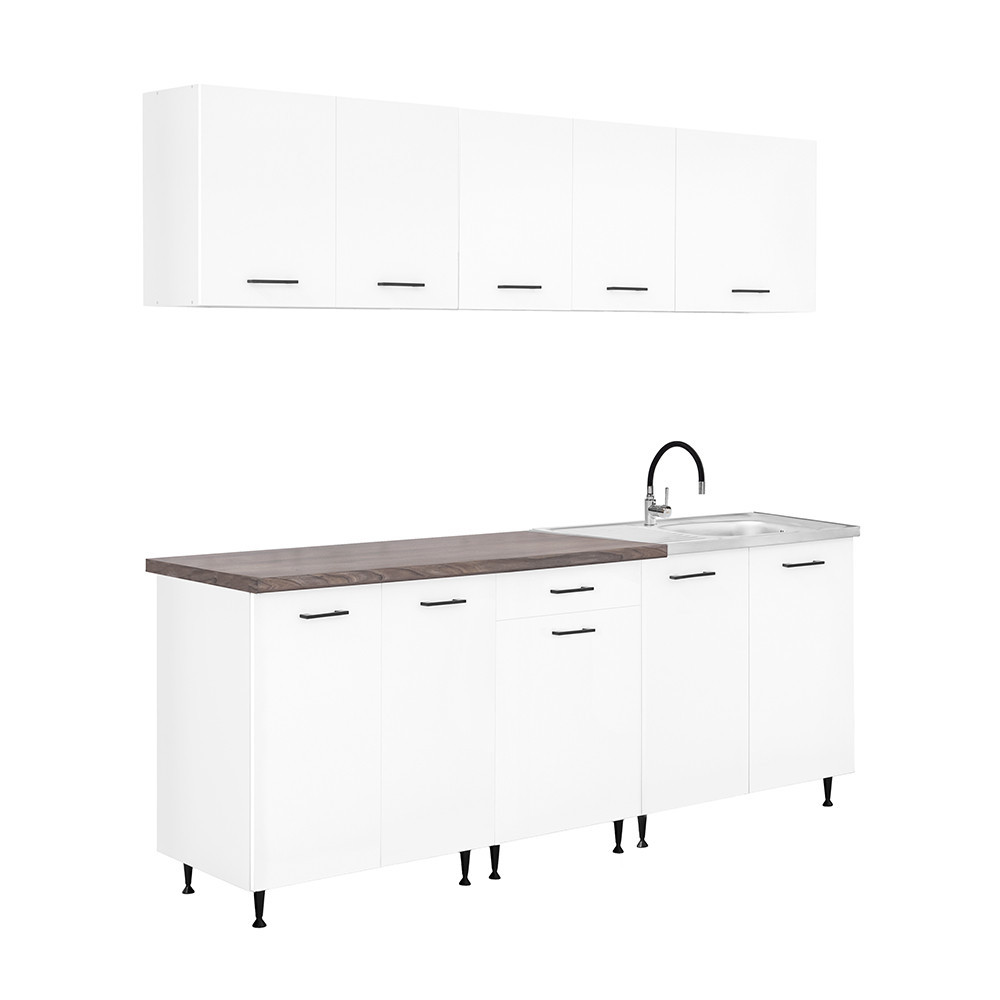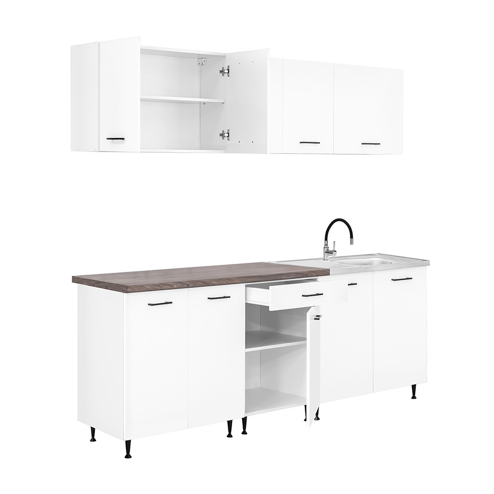 Dulapul de bucătărie cu lățimea de 220 cm este format dintrei unități superioare și trei unități inferioare care oferă spațiu practic de depozitare pentru ustensilele de bucătărie. Cele două dulapuri inferioare cu lățimea de 80 cm sunt potrivite pentru oale mai mari sau ustensile de bucătărie, în timp ceunitatea cu sertare și uși de 60 cm este ideală pentru organizarea tacâmurilor și a accesoriilor mici.