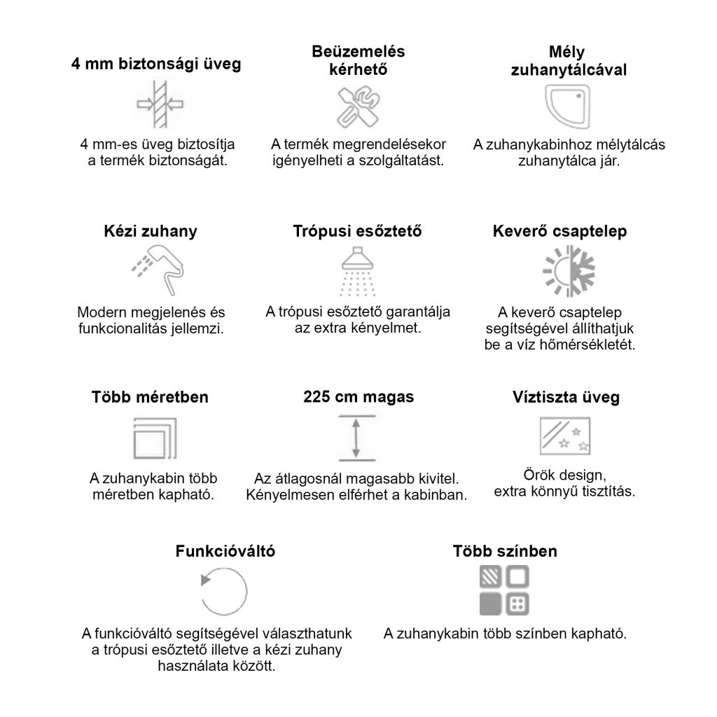 Cabana 225 x 80 x 80 cm, datorită înălțimii sale oferă un confort mai mare decât media, dimensiunea tăvii adânci este de 80 x 80 x 43 cm. Designul poate fi instalat într-un colț, oferind o soluție de economisire a spațiului. Produsul este dotat standard cu un duș manual și un cap de duș cu efect de ploaie tropicală, oferind confort maxim. Este disponibil în două dimensiuni, 80 și 90 cm, așa că se potrivește perfect în orice baie.