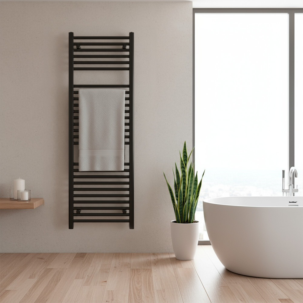 Válaszd a Leziter egyenes törölközőszárító radiátor 1200x500 mm fekete modellt, és tedd a fürdőszobád még stílusosabbá és kényelmesebbé – minden nap!
