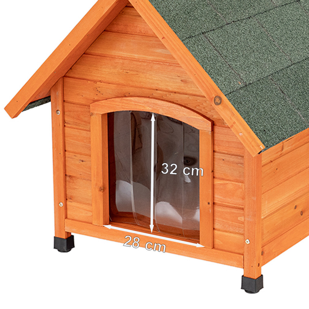 Acoperișul căsuței pentru câini este acoperit cu hârtie gudronată șlefuită, cu aspect de cărămidă, care asigură rezistența la intemperii și oferă protecție suplimentară. Consolele largi ale acoperișului protejează atât părțile exterioare, cât și intrarea de ploaie, vânt și frig. Ușa transparentă cu lamele este ideală pentru vreme ploioasă și protejează împotriva curenților de aer.