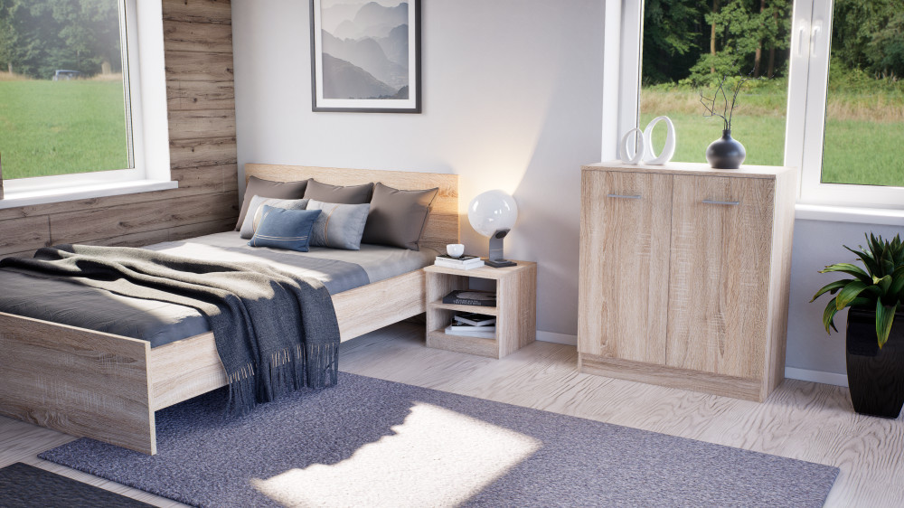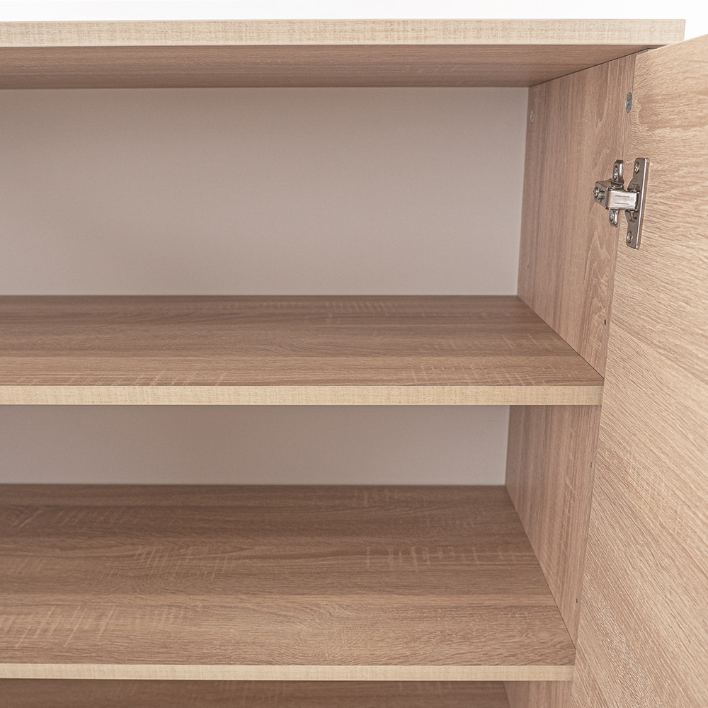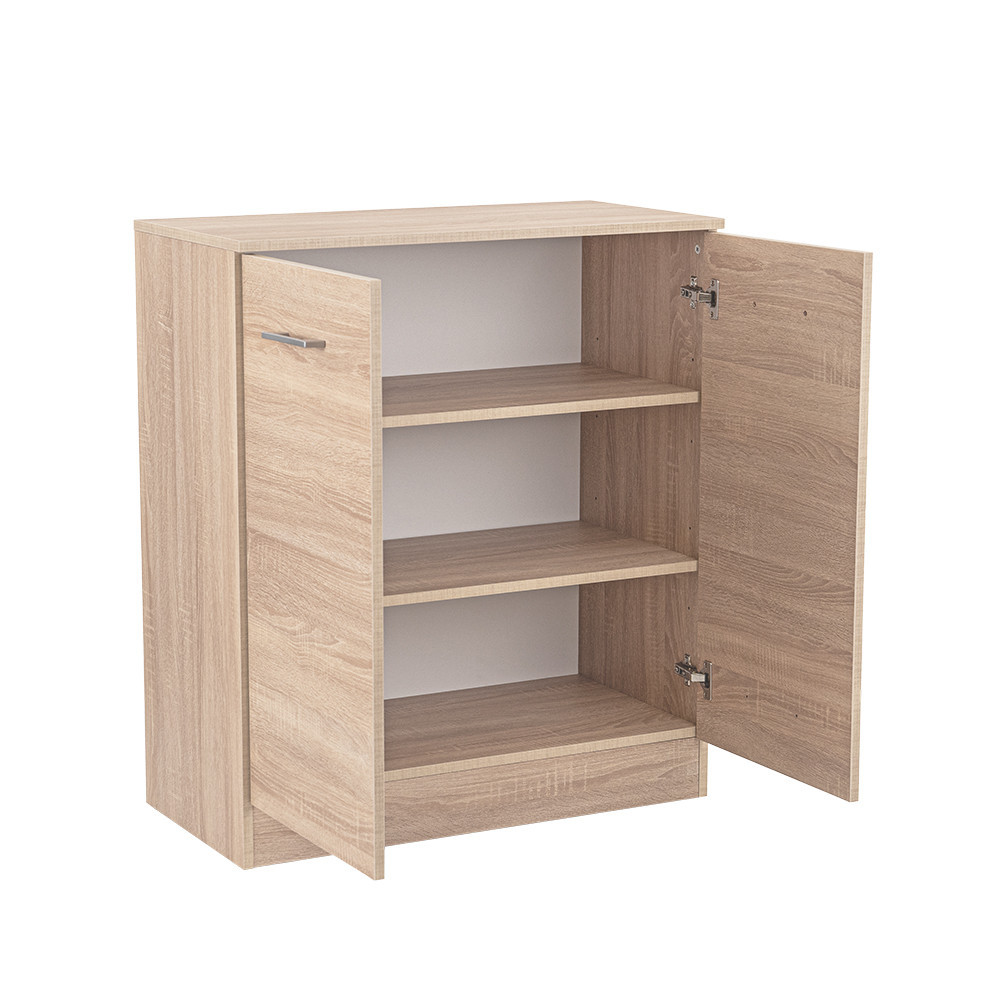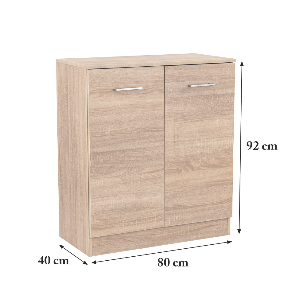 Comoda Miami , cu fațadă și corp din stejar sonoma, conferă claritate și eleganță spațiului, în timp ce materialul de calitate al plăcilor de mobilier garantează durabilitate și rezistență. Dimensiunile sale - 40 cm adâncime, 80 cm lățime, 92 cm înălțime - sunt ideale pentru orice cameră. În spatele ușilor cu două canate care se deschid ale comodei se află 3 rafturi , perfecte pentru depozitarea hainelor, cărților sau chiar a echipamentelor de birou. Designul modern este completat de mânere din plastic cu efect cromat mat , care fac aspectul și mai curat.