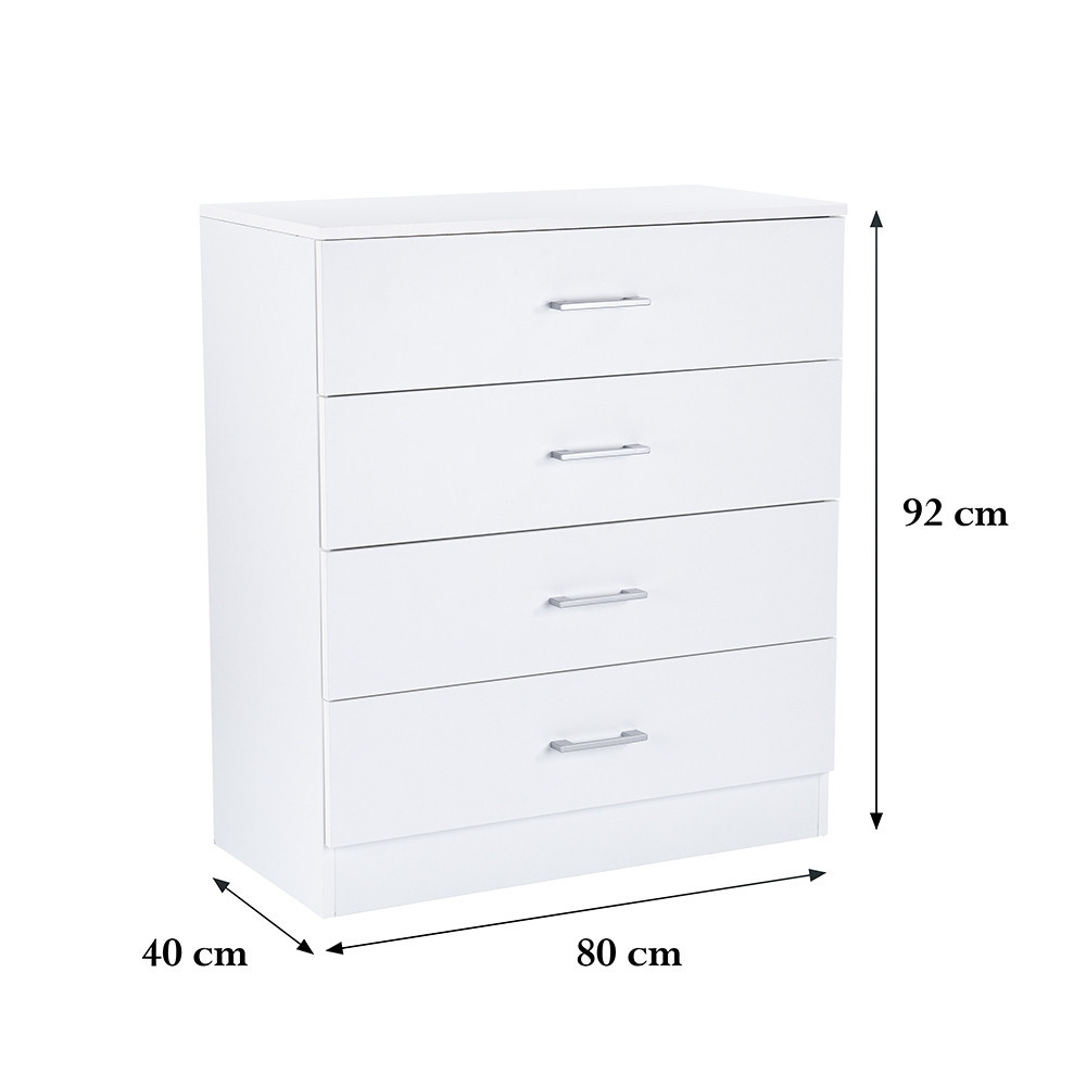 Comoda Miami, cu fața și corpul său alb, conferă puritate și eleganță spațiului, în timp ce materialul de calitate al plăcii de mobilier garantează durabilitate și rezistență. Dimensiunile sale - 40 cm adâncime, 80 cm lățime, 92 cm înălțime - sunt ideale pentru orice cameră. Comoda este proiectată cu 4 sertare pe roți , perfecte pentru depozitarea hainelor, cărților sau chiar a rechizitelor de birou. Designul modern este completat de mânere din plastic cu efect cromat mat , care fac aspectul și mai curat.