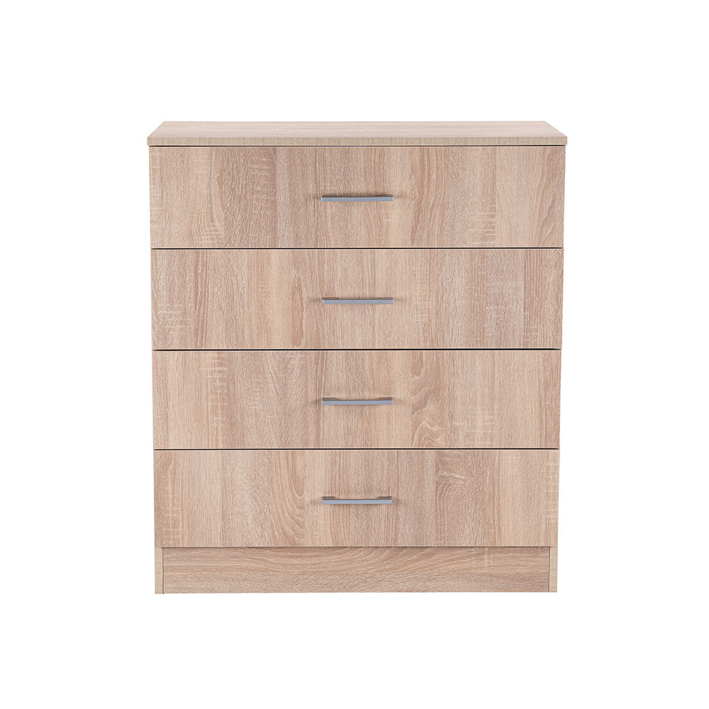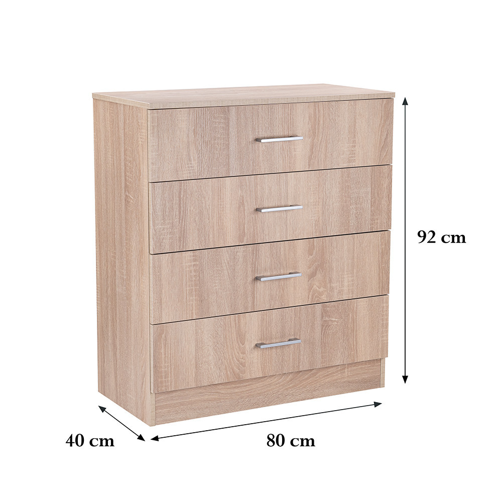 Comoda Miami , cu fațadă și corp din stejar sonoma, conferă puritate și eleganță spațiului, în timp ce materialul de calitate al plăcilor de mobilier garantează durabilitate și rezistență. Dimensiunile sale - 40 cm adâncime, 80 cm lățime, 92 cm înălțime - sunt ideale pentru orice cameră. Comoda este proiectată cu 4 sertare pe roți , perfecte pentru depozitarea hainelor, cărților sau chiar a rechizitelor de birou. Designul modern este completat de mânere din plastic cu efect cromat mat , care fac aspectul și mai curat.