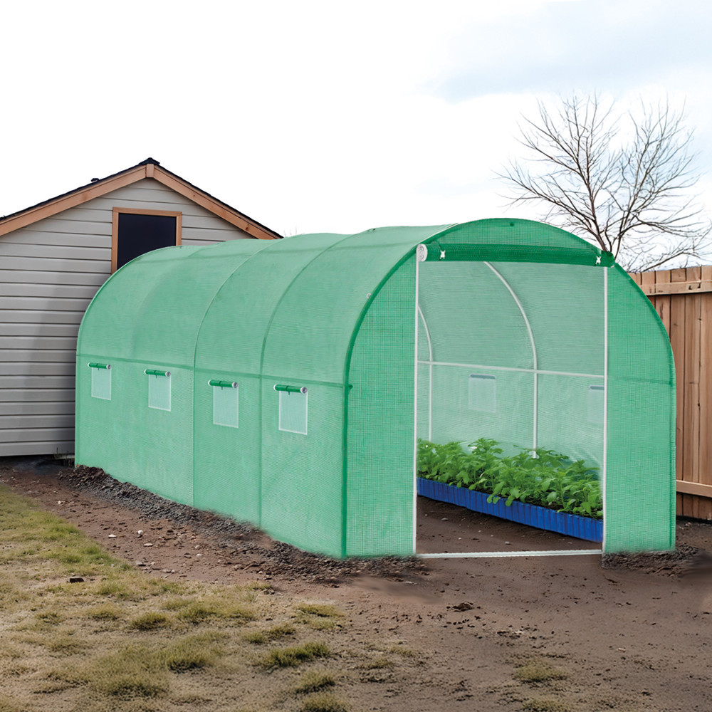 Cortul modern din folie este echipat cu o ușă pliabilă practică, care facilitează accesul. Cele 8 orificii de ventilație laterale ale cortului sunt prevăzute cu plasă pentru a preveni pătrunderea insectelor, asigurând în același timp o circulație adecvată a aerului. Ferestrele ajută la reglarea umidității, crescând astfel randamentul culturilor. Cortul din folie poate fi utilizat în orice condiții meteorologice, fiind o soluție ideală pentru cultivarea plantelor în grădină sau pe proprietate.