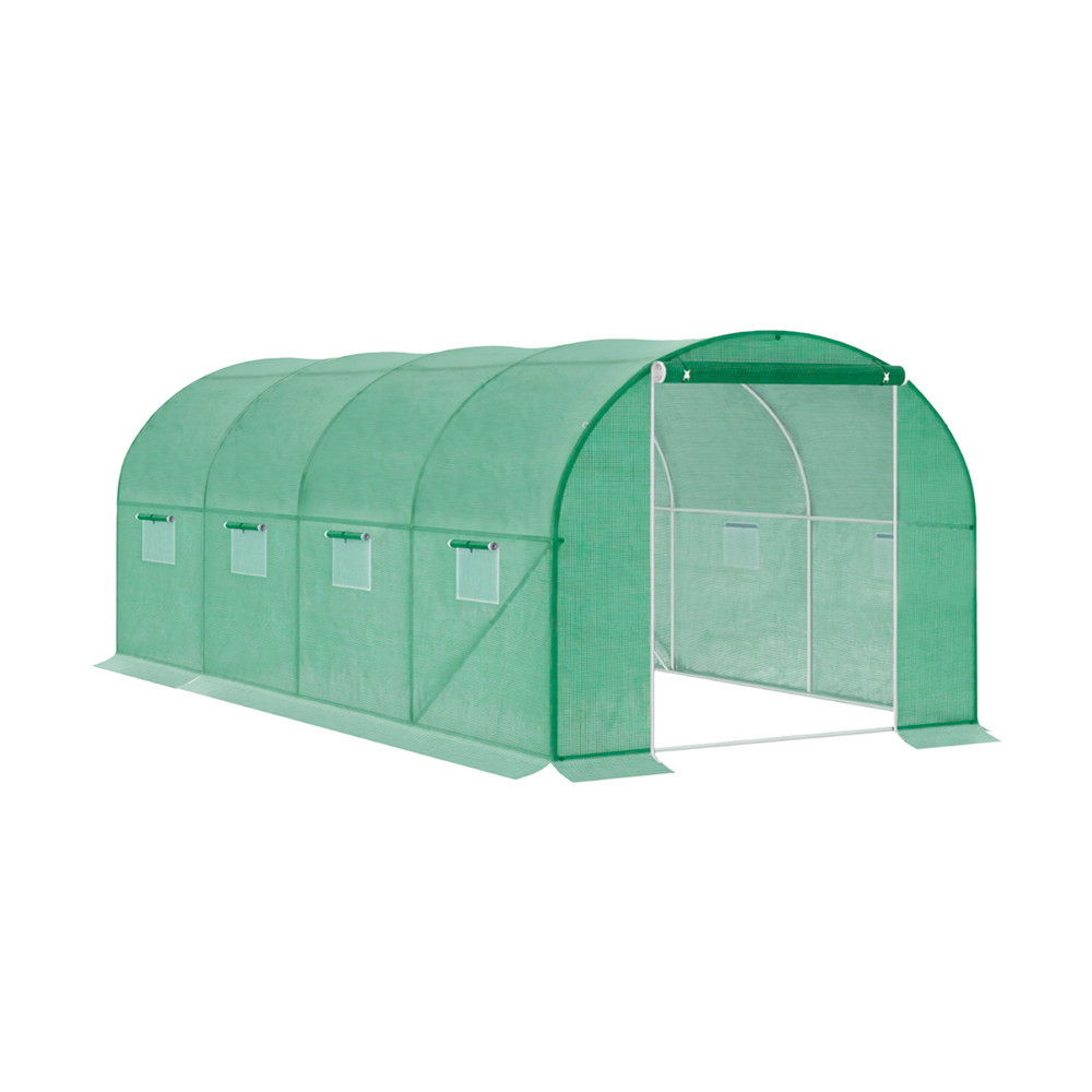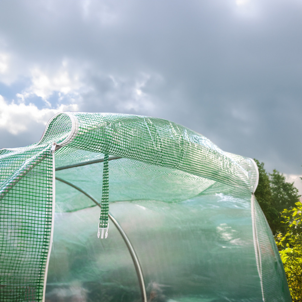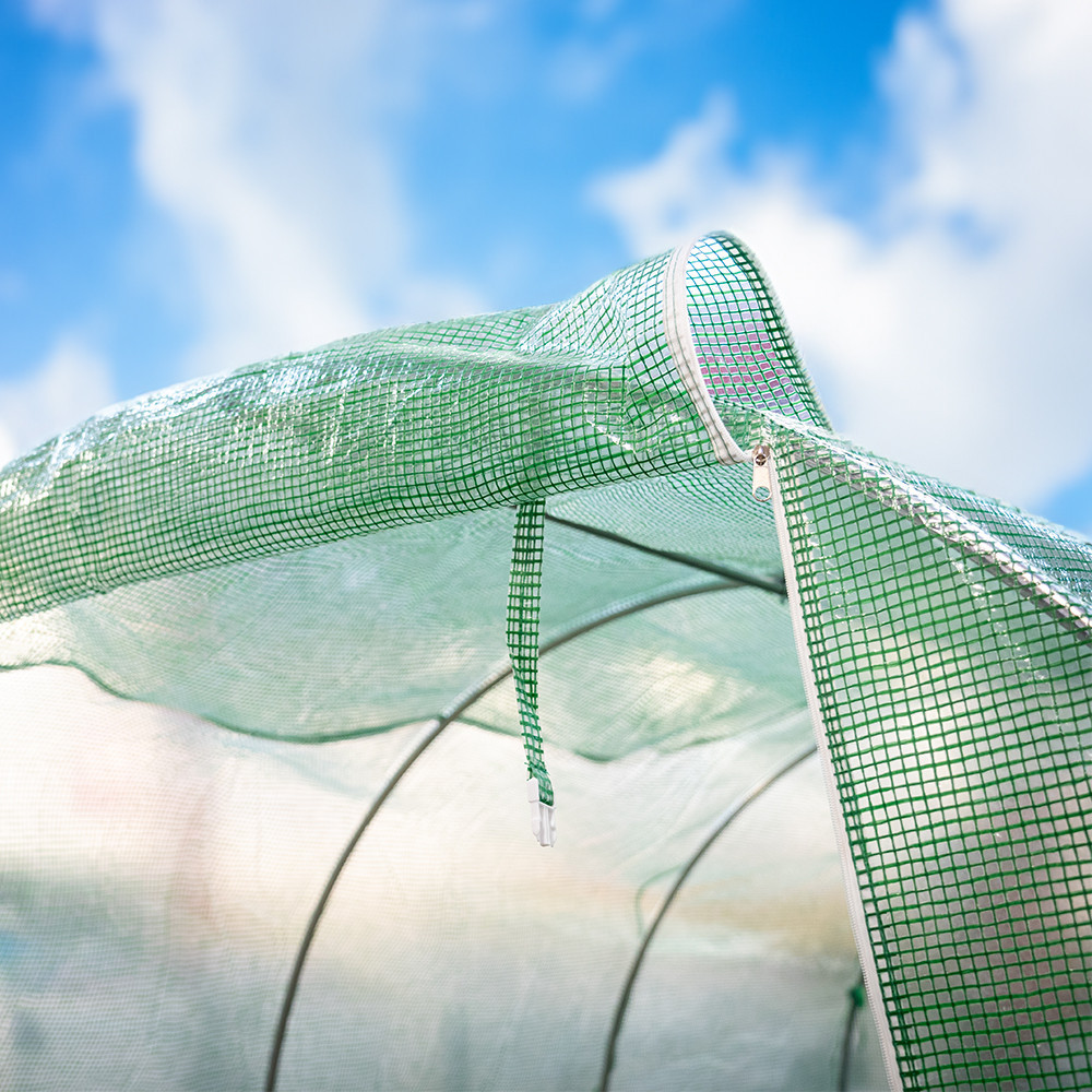 Cortul modern din folie este echipat cu o ușă pliabilă practică, care facilitează accesul. Cele 8 orificii de ventilație laterale ale cortului sunt prevăzute cu plasă pentru a preveni pătrunderea insectelor, asigurând în același timp o circulație adecvată a aerului. Ferestrele ajută la reglarea umidității, crescând astfel randamentul culturilor. Cortul din folie poate fi utilizat în orice condiții meteorologice, fiind o soluție ideală pentru cultivarea plantelor în grădină sau pe proprietate.