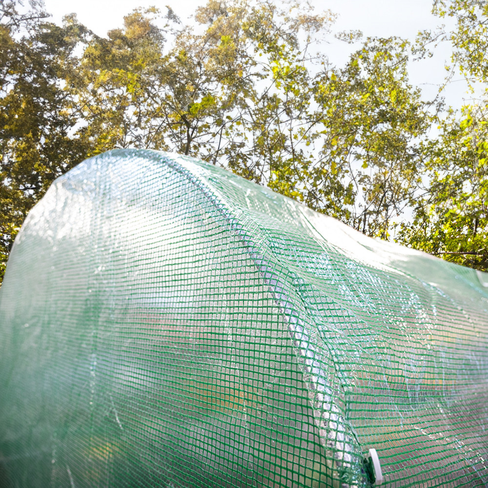 Cortul din folie are o structură solidă, ranforsată, din oțel galvanizat, ceea ce îl face mult mai durabil și stabil decât structurile tradiționale. Rama din oțel nu este doar rezistentă la coroziune, ci, datorită designului său ranforsat, oferă o protecție mai mare împotriva vânturilor puternice și a altor efecte meteorologice. Iar fixarea pereților laterali asigură o fixare fermă a cortului pe sol, împiedicând deplasarea foliei și garantând o structură durabilă.