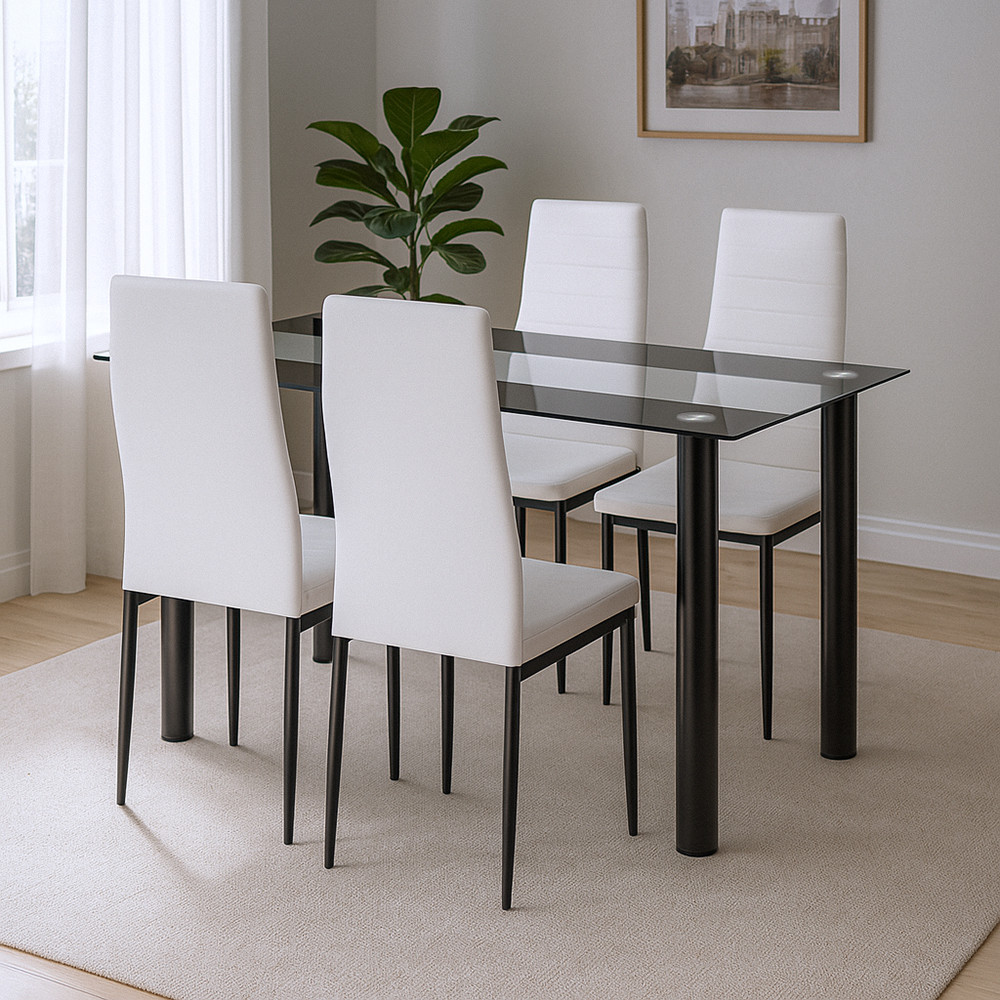 Combinația de culori alb-negru se armonizează perfect cu schema de culori a mesei din sticlă gri fumuriu, făcând ca întregul set să fie unificat și echilibrat vizual.