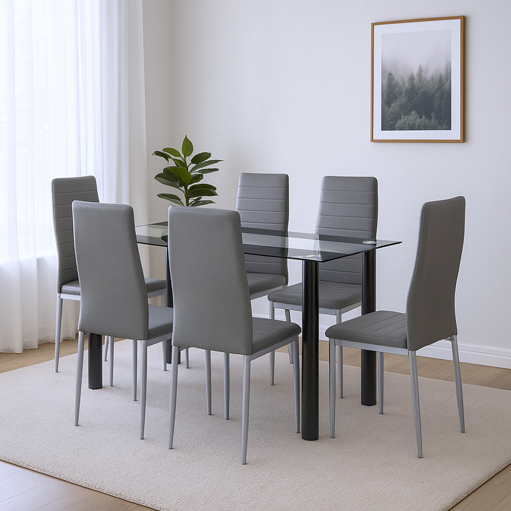 Griul se armonizează perfect cu schema de culori a mesei de sticlă gri fumuriu, făcând întregul set unitar și echilibrat vizual.