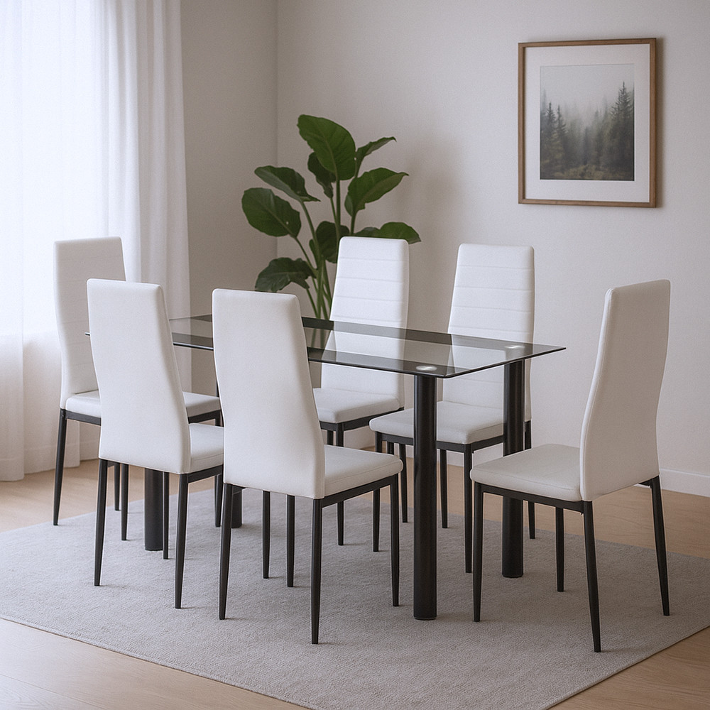 Combinația de culori alb și negru se armonizează bine cu schema de culori a mesei din sticlă gri fum, făcând întregul set coerent și echilibrat din punct de vedere vizual.