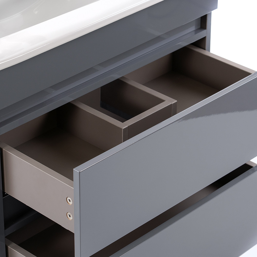 Pe lângă funcționalitate, desigur, aspectul mobilierului a acordat, de asemenea, o mare atenție. Culoarea sa gri antracit lucios și curat și modern Datorită liniilor sale, creează armonie în atmosfera tuturor băilor.