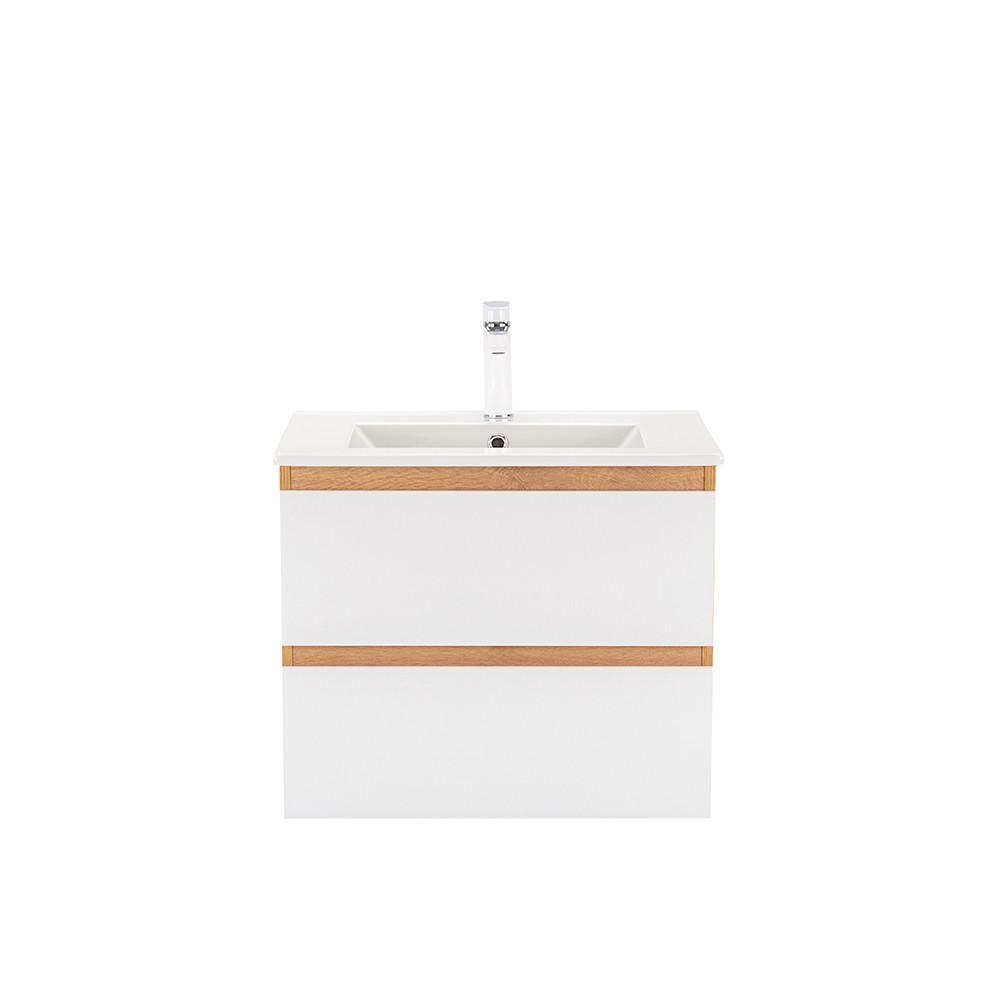 Mobilierul complet de baie Vario Forte 60 este o alegere elegantă și practică pentru o baie modernă. Dimensiunile sale compacte sunt ideale pentru băi mici și medii, închiderea la margine la 45 de grade oferă un efect modern, iar designul alb-stejar conferă spațiului un aspect elegant. Sertarul cu închidere silențioasă și designul suspendat oferă confort și curățare ușoară, în timp ce materialele de calitate asigură o durată lungă de viață.