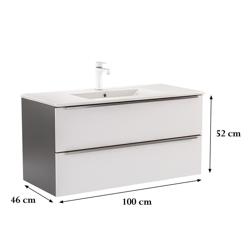 Mobilierul complet de baie Vario Clam 100 este o alegere elegantă și practică pentru o baie modernă. Dimensiunile sale compacte sunt ideale pentru băi mici și medii, iar profilul metalic al mânerului conferă un efect de patină, în timp ce designul alb-antracit conferă spațiului un aspect elegant. Sertarul cu închidere silențioasă și designul suspendat oferă confort și curățare ușoară, în timp ce materialele de calitate asigură o durată lungă de viață.