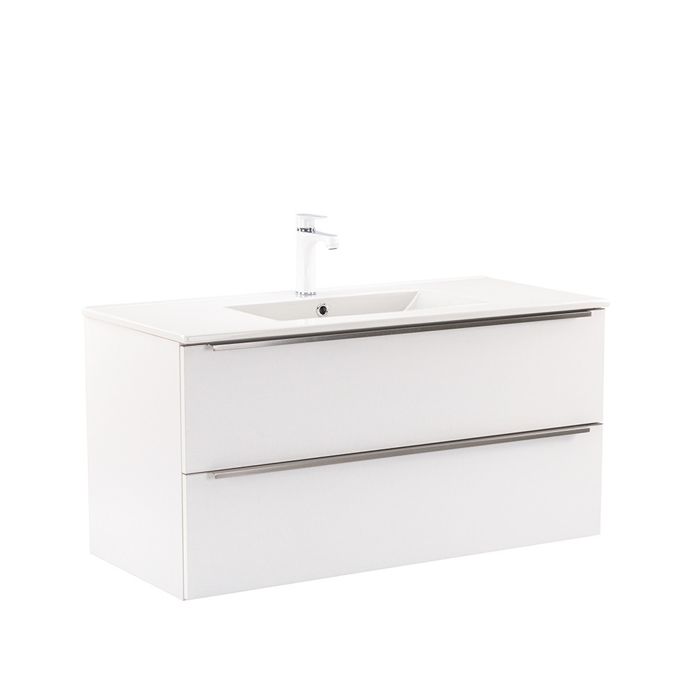 Mobilierul complet de baie Vario Trim 100 este o alegere elegantă și practică pentru o baie modernă. Dimensiunile sale compacte sunt ideale pentru băi mici și medii, iar profilul metalic al mânerului conferă un efect de patină, în timp ce designul alb pe alb conferă spațiului un aspect elegant. Sertarul cu închidere silențioasă și designul suspendat oferă confort și curățare ușoară, în timp ce materialele de calitate asigură o durată lungă de viață.
