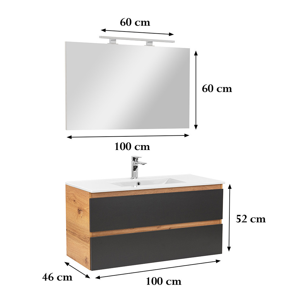 Mobilierul complet de baie Vario Forte 100 este o alegere elegantă și practică pentru o baie modernă. Dimensiunile sale compacte sunt ideale pentru băi mici și medii, iar designul din stejar-antracit conferă spațiului un aspect elegant. Sertarul cu închidere silențioasă și designul suspendat oferă confort și curățare ușoară, în timp ce materialele de calitate asigură o durată lungă de viață.