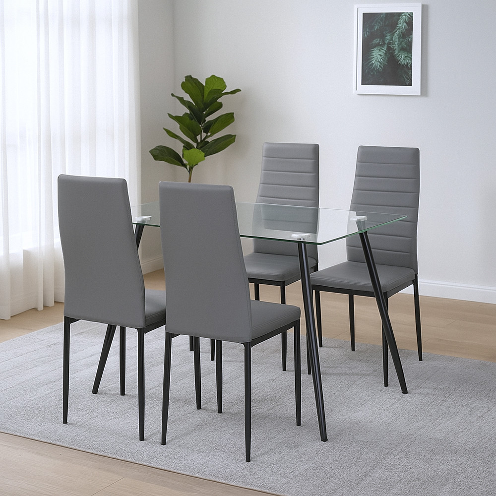 Setul de masă Nash 4 1 combină designul curat cu cel funcțional. Masa din sticlă Lana și scaunele Tino NOVA combină minimalismul , stabilitatea și confortul într-o armonie perfectă. Combinația modernă de culori gri-negru conferă spațiului caracter vizual, în timp ce nuanța sa neutră îl face ușor de integrat în multe interioare - fie că este vorba de stil scandinav, modern sau industrial.