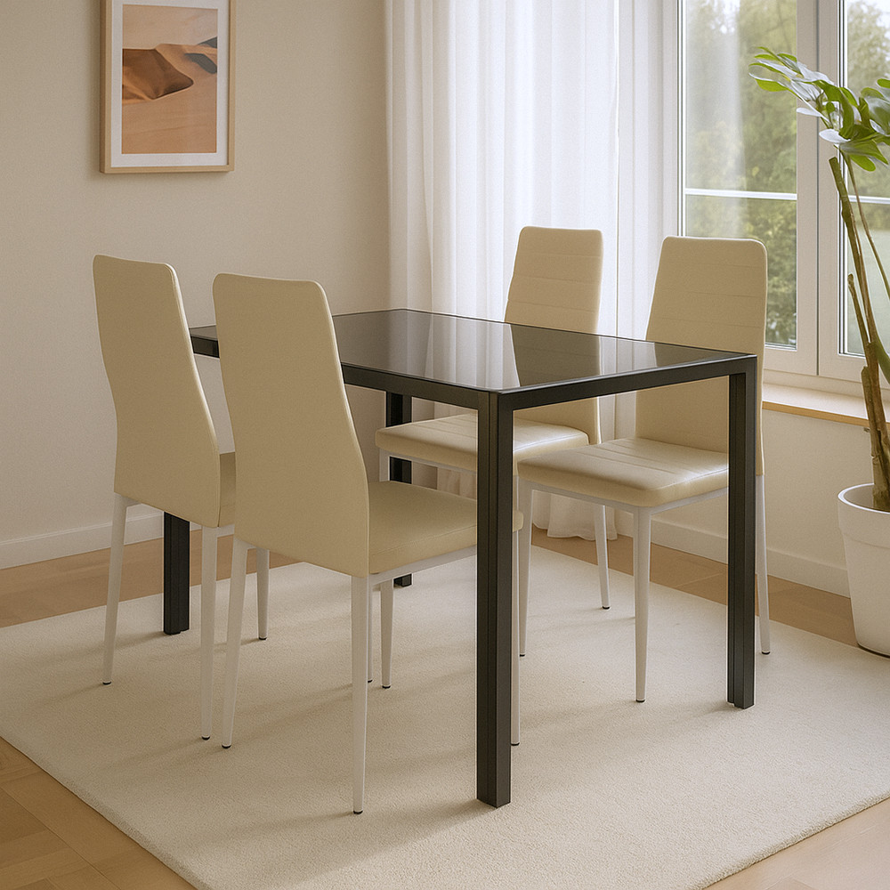 THE Set de masă Nicole 4 în 1 o alegere excelentă pentru cei cărora le plac tonurile îndrăznețe și închise, dar nu vor să facă compromisuri în ceea ce privește confortul și funcționalitatea. masă de sticlă gri fumurie și scaune de sufragerie bej Acestea formează o unitate armonioasă ce se integrează perfect într-un interior modern, minimalist sau în stil industrial.