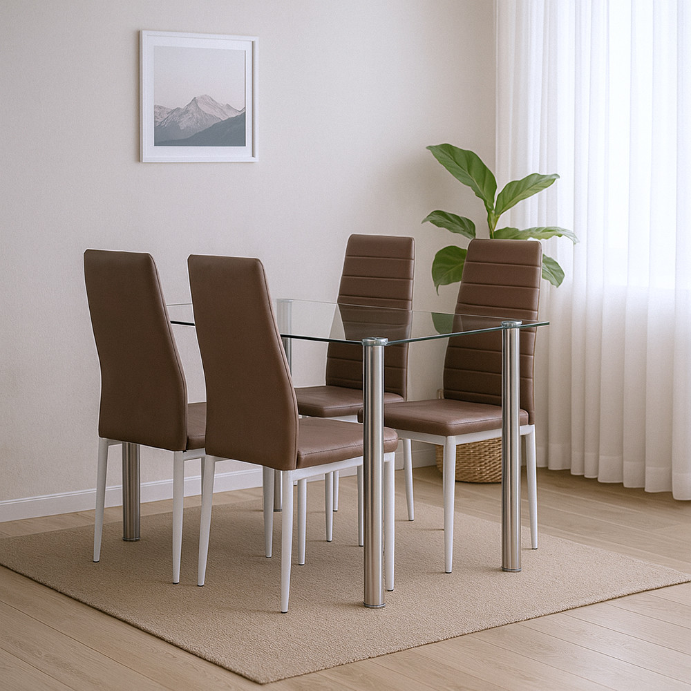 THE Set de masă Nolen 4 în 1 O alegere ideală pentru cei care caută o piesă de mobilier elegantă, dar funcțională. Masa Berna din sticlă securizată și scaunele de dining Tino NOVA negre formează o unitate armonioasă - o întâlnire între designul modern și minimalist și confortul tangibil într-un singur set.
