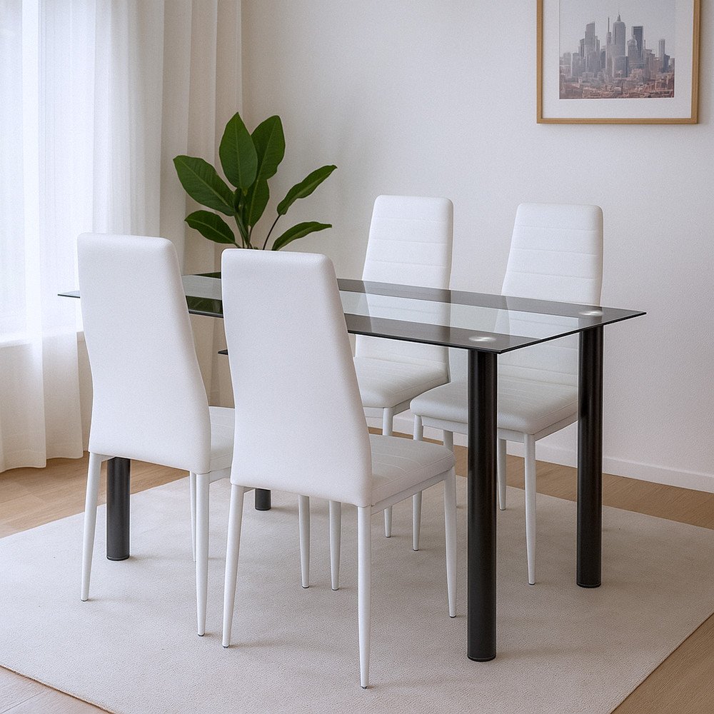 THE Set de masă Norman 4 în 1 în fiecare detaliu al minimalism modern și funcționalitate sigură întâlnire. Cel/Cea/Cei/Cele Masă de sufragerie Riona 140 cm Datorită dimensiunii sale, permite mese confortabile, fie pentru o familie mică, fie pentru un grup de prieteni. Scaune Tino NOVA Cu schema lor de culori negre și designul durabil, acestea ies în evidență nu doar prin aspect, ci și prin ușurința în utilizare.
