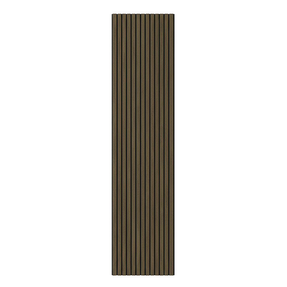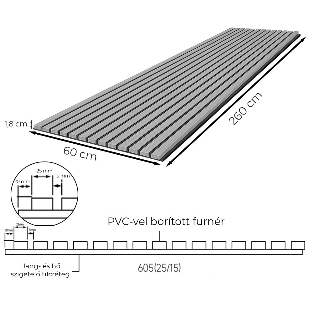 A 25 mm széles lécek 15 mm-es hézagokkal modern, ritmusos mintát alkotnak, amely javítja a hanghullámok elnyelését és szóródását. A sötét akusztikai háttér kiemeli a olajos tölgy árnyalat eleganciáját, míg az egyszerű rögzíthetőség lehetővé teszi falra vagy mennyezetre való telepítését otthonokban, irodákban és vendéglátóhelyeken egyaránt.