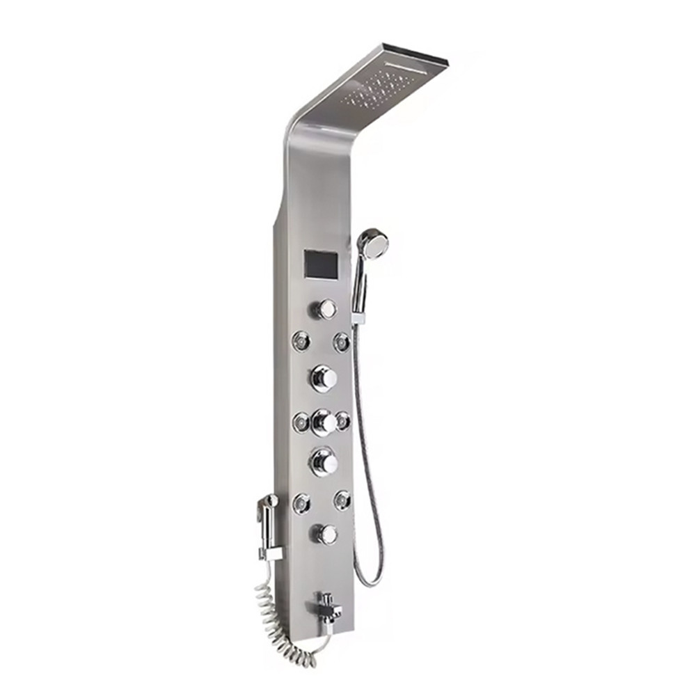 Az Aquapro hidromasszázs zuhanypanel elegáns, szálcsiszolt rozsdamentes acélból készül, amely garantálja a hosszú élettartamot és a könnyű tisztíthatóságot. A kék LED világítás nemcsak látványos, hanem megteremti a spa-hangulatot is a fürdőben, miközben a digitális kijelző mindig pontosan mutatja a vízhőmérsékletet.