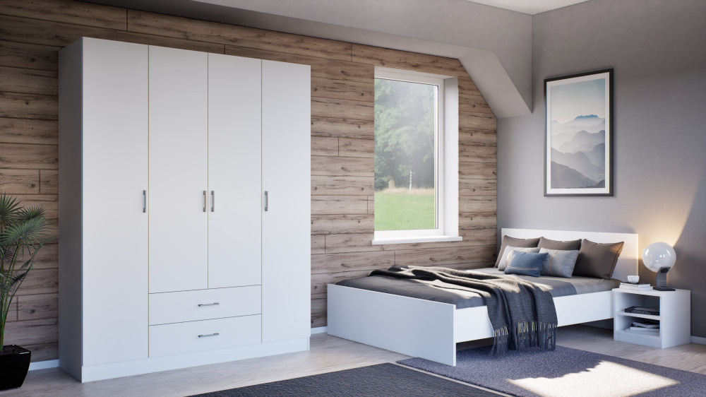 Patul Miami este fabricat din lemn de mobilier de înaltă calitate, cu un bufet alb, tăblie și capăt de pat albe. Dimensiuni cadru pat: 205 x 145 cm. Dimensiunile tăbliei patului sunt: 80 x 145 cm. Dimensiunile saltelei care se potrivește în cadrul patului: 200 x 140 cm