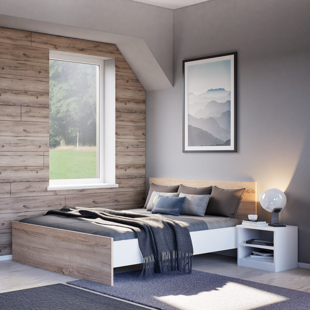 | Material | Mobilier de înaltă calitate, cu panouri laterale albe, tăblie și capăt de pat din stejar Sonoma. |