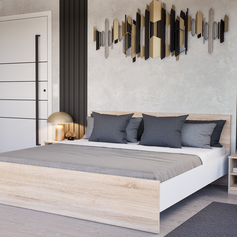 | Material | Mobilier de înaltă calitate, cu panouri laterale albe, tăblie și capăt de pat din stejar Sonoma. |