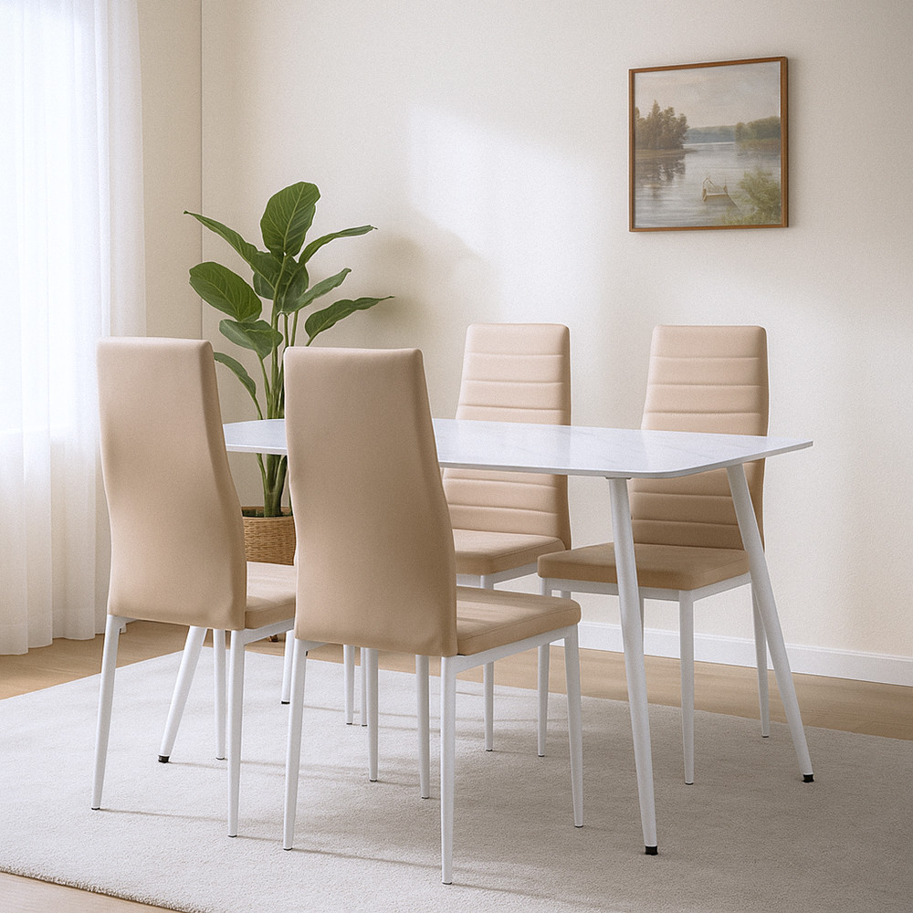 THE Renton într-un set primirea unui loc Scaune de sufragerie Tino NOVA Cu aspectul lor sofisticat și designul stabil, acestea se potrivesc perfect cu masa Bora. suprafață de șezut din piele textilă bej moale, dar durabil, picioare metalice vopsite în câmp electrostatic gri și emană eleganță, garantând în același timp un suport fiabil.