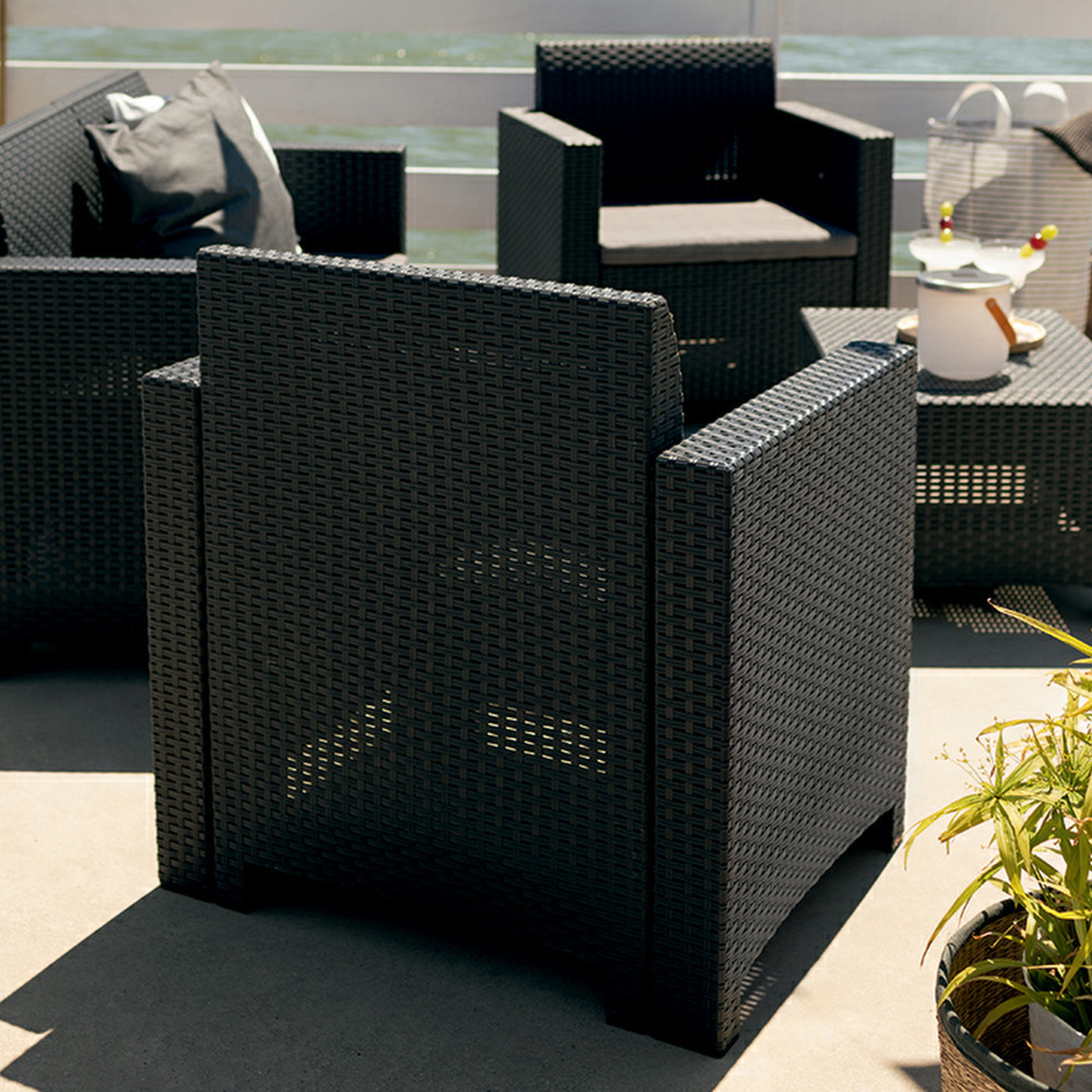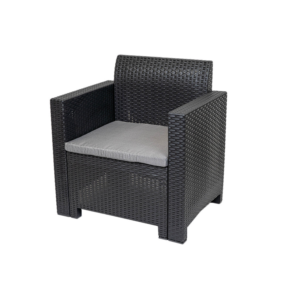 Numele acestui scaun de grădină, fabricat în Italia, este puțin înșelător, deoarece oferă confortul unui fotoliu datorită designului confortabil al pernei și cotierelor. Culoarea grafit și suprafața din technoratan, care amintește de ratanul original, conferă mobilierului un aspect elegant și modern, sporind atmosfera oricărui spațiu exterior, fie că este vorba de o grădină, un balcon sau o terasă de restaurant. Această piesă de mobilier este o alegere atemporală, deoarece nu necesită întreținere și este fabricată din plastic rezistent la radiațiile UV și la condițiile meteorologice.