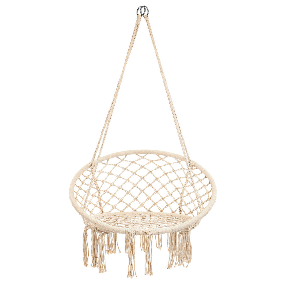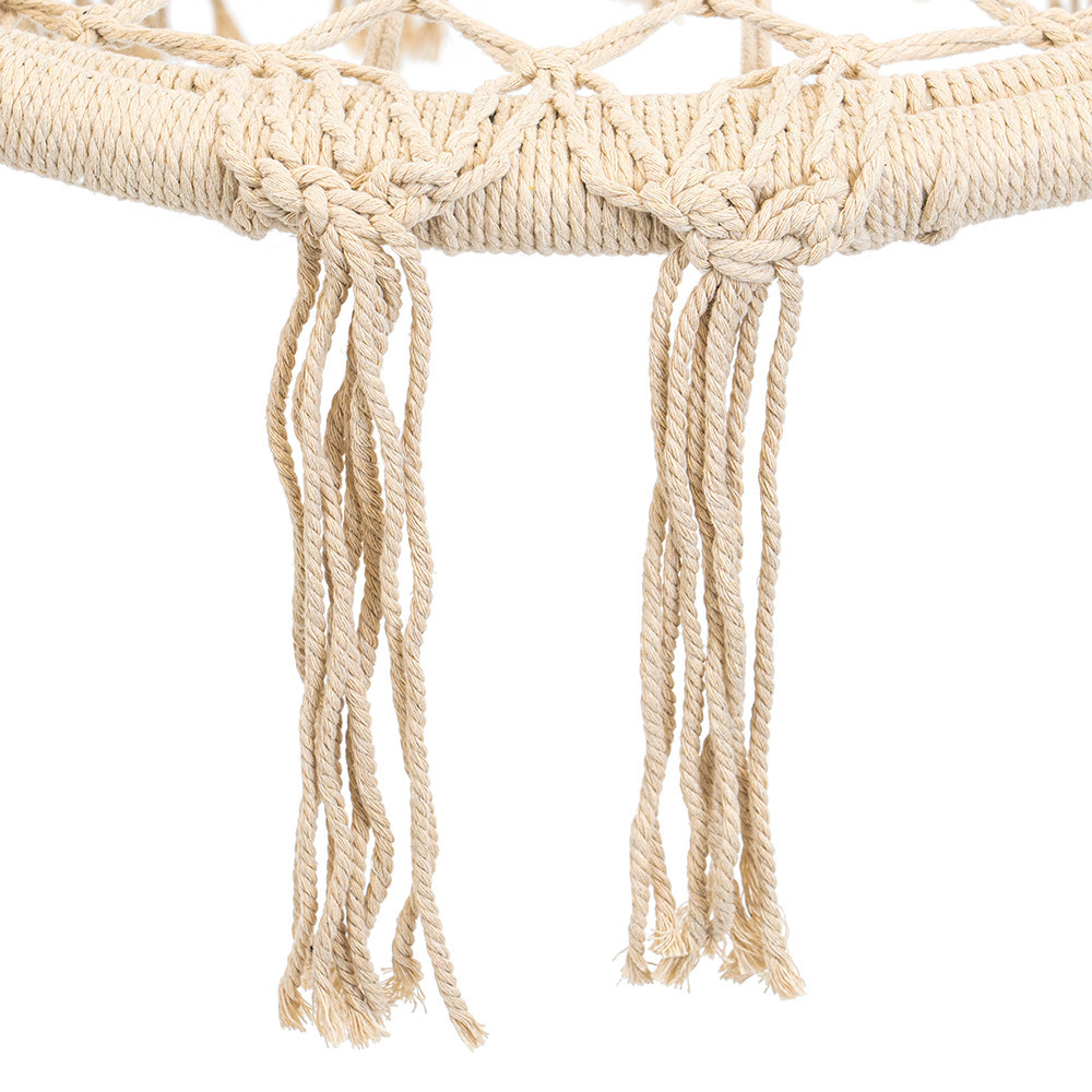 Transformă orice colț din casă, balcon sau terasă într-o zonă de relaxare cu scaunul hamac suspendat Leziter Cardenas, în nuanță bej. Designul tip plasă, cu franjuri decorative, oferă un look boem și aerisit, perfect pentru amenajări moderne sau clasice.