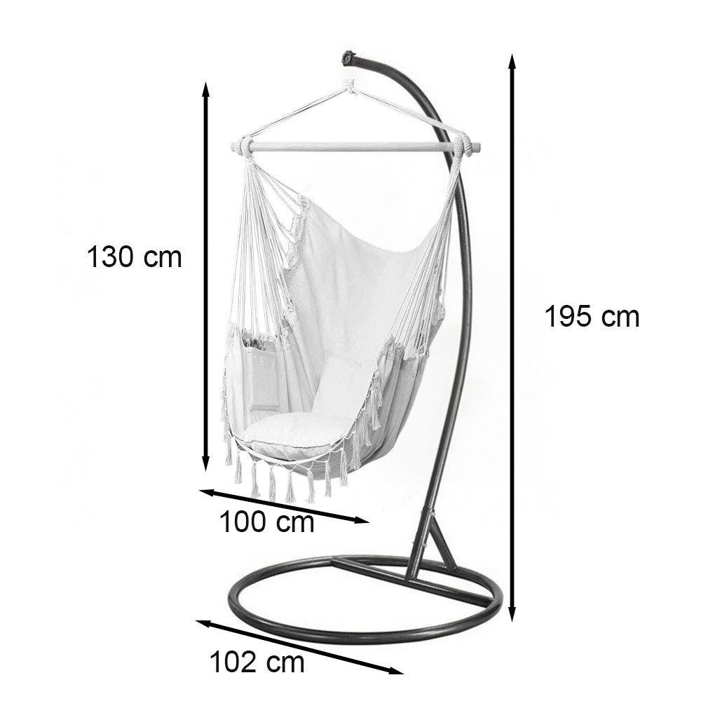 A fehér színű függőfotel állvány masszív, időjárásálló acélból készült, így garantálja a hosszú távú használatot és tartósságot. A 195 cm magas, 102 cm átmérőjű alap stabil tartást biztosít még akkor is, ha teljes súllyal hintázol a székben.
