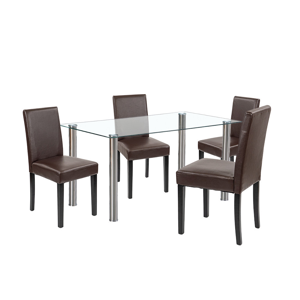 Setul include și patru scaune Leziter Kelly, tapițate cu piele ECO maro. Pe lângă aspectul elegant, aceste scaune sunt extrem de ușor de curățat. Șezutul din spumă cu grosimea de 4 cm oferă confort chiar și în timpul meselor mai lungi, iar picioarele stabile din lemn de pin, cu o capacitate de încărcare de 120 kg, garantează fiabilitate pe termen lung.