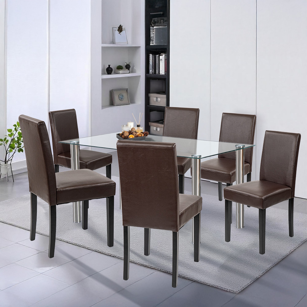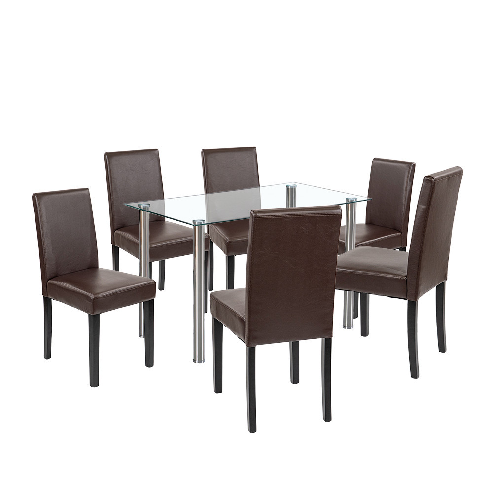 Setul include și șase scaune Leziter Kelly, tapițate cu piele ECO maro. Pe lângă aspectul elegant, aceste scaune sunt extrem de ușor de curățat. Șezutul din spumă cu grosimea de 4 cm oferă confort chiar și în timpul meselor mai lungi, iar picioarele stabile din lemn de pin, cu o capacitate de încărcare de 120 kg, garantează fiabilitate pe termen lung.