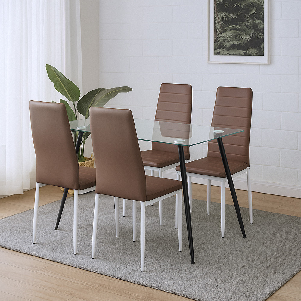 THE Set de masă Cruz 4 în 1 creat pentru cei care iubesc minimalismul modern cu o înfățișare plină de caracter Efectul aerisit al blatului de sticlă și greutatea ramelor negre creează un contrast atât curat, cât și puternic. Maroul și albul Scaune Tino NOVA și negrul Bază de masă din sticlă Lana În perfectă armonie, ele formează o unitate cu adevărat elegantă, dar funcțională.