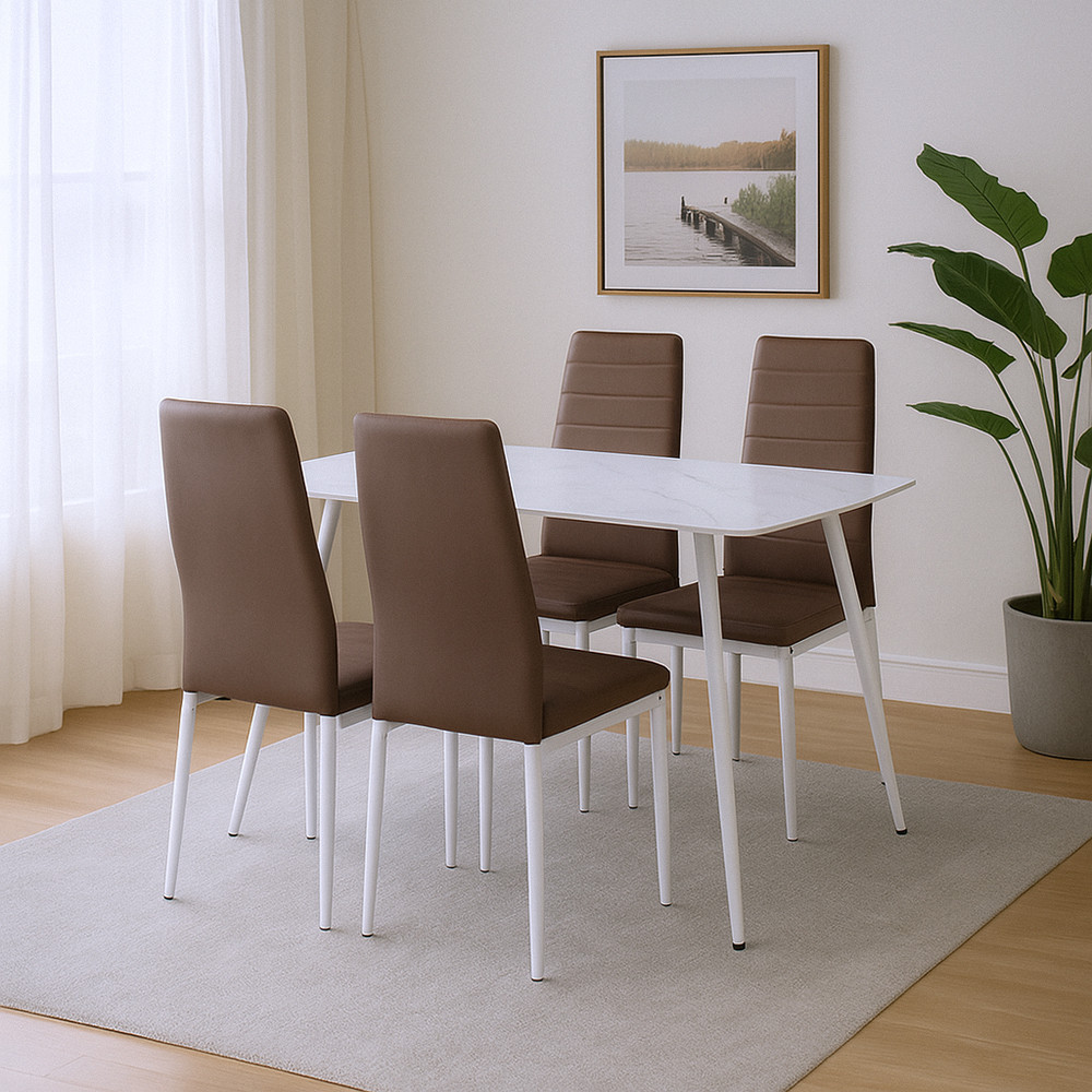 Setul de masă Jenna este un exemplu perfect al modului de a combina funcționalitatea cu claritatea vizuală. Contrastul dintre blatul de masă din piatră sinterizată, cu efect de ardezie deschisă la culoare, și scaunele complet maro este atât elegant, cât și plin de caracter . Efectul general este îndrăzneț, dar sofisticat, ceea ce îl face o alegere ideală atât pentru spațiile moderne, minimaliste, cât și pentru cele industriale.
