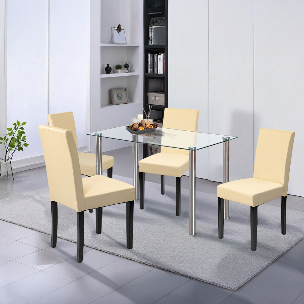 Setul include și patru scaune Leziter Kelly, tapițate cu piele ECO bej. Pe lângă aspectul elegant, aceste scaune sunt extrem de ușor de curățat. Șezutul din spumă cu grosimea de 4 cm oferă confort chiar și în timpul meselor mai lungi, iar picioarele stabile din lemn de pin, cu o capacitate de încărcare de 120 kg, garantează fiabilitate pe termen lung.