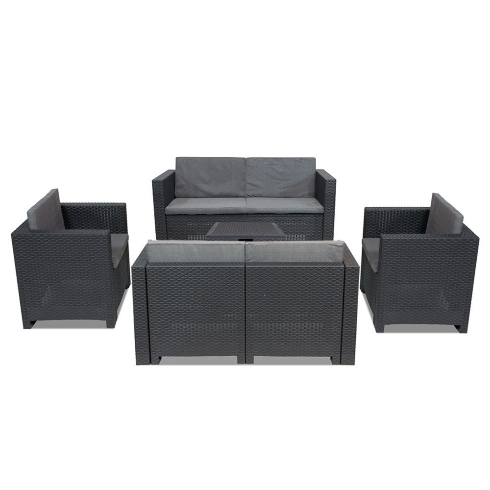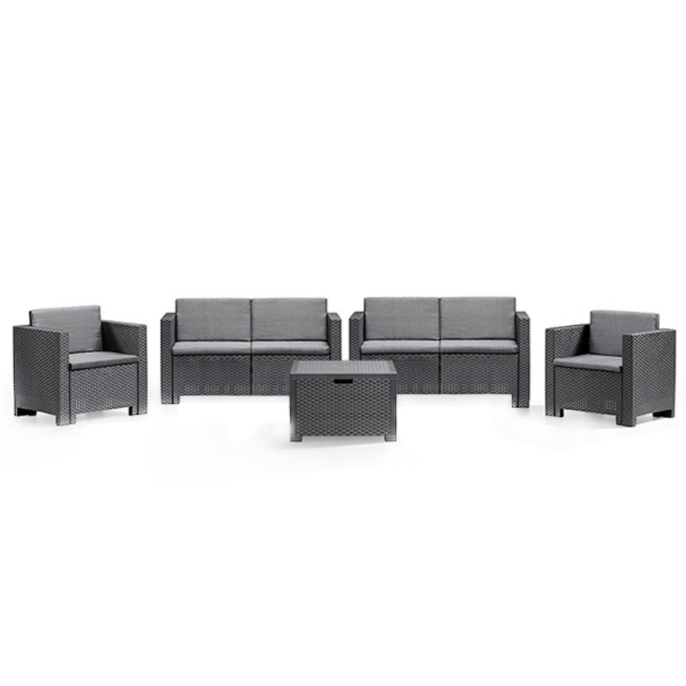 Setul de mobilier de culoare grafit , confortabil și elegant, fabricat în Italia, include două fotolii de 57,5x 64x 75 cm, două canapele cu două locuri de 57,5x 64x 131 cm și o masă dreptunghiulară de 40x 64x 64 cm. Acest set de mobilier de grădină pentru 6 persoane oferă suficient spațiu pentru familie și oferă senzația că stau în sufragerie, dar totuși pot petrece timp afară. Este, de asemenea , o alegere excelentă dacă îți place să te relaxezi și să citești în curte în timpul zilei, întins pe o canapea. Este potrivit pentru reuniuni de familie și evenimente de afaceri, deoarece face ca orice spațiu să fie modern și confortabil prin aspectul său .