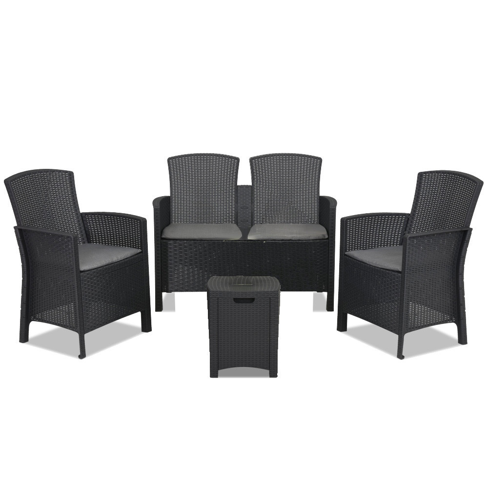 Setul de mobilier de grădină din ratan de culoare grafit este format din două fotolii de 56 x 90 x 60 cm, o canapea de 59 x 90 x 112 cm și o masă dreptunghiulară de 39x 39x 46 cm. Acesta este un produs de înaltă calitate, fabricat din plastic turnat prin injecție de cea mai înaltă calitate.