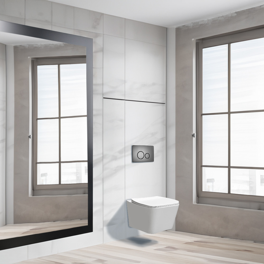 Setul include vasul toaletă fără ramă Tinos, montat pe perete, rezervorul de toaletă montat pe perete și placa de acționare cromată pentru toaletă ROYA 021. Să vedem ce beneficii oferă aceste produse: