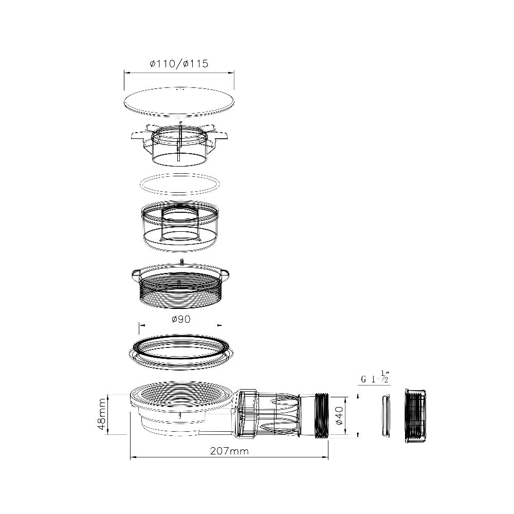 Desenul tehnic anexat prezintă în detaliu dimensiunile și punctele de asamblare ale sifonului, permițând o instalare precisă și fără probleme. Dimensiunile se potrivesc exact cu conexiunile standard, ceea ce face ca sifonul să fie compatibil cu majoritatea sistemelor de cădițe de duș.