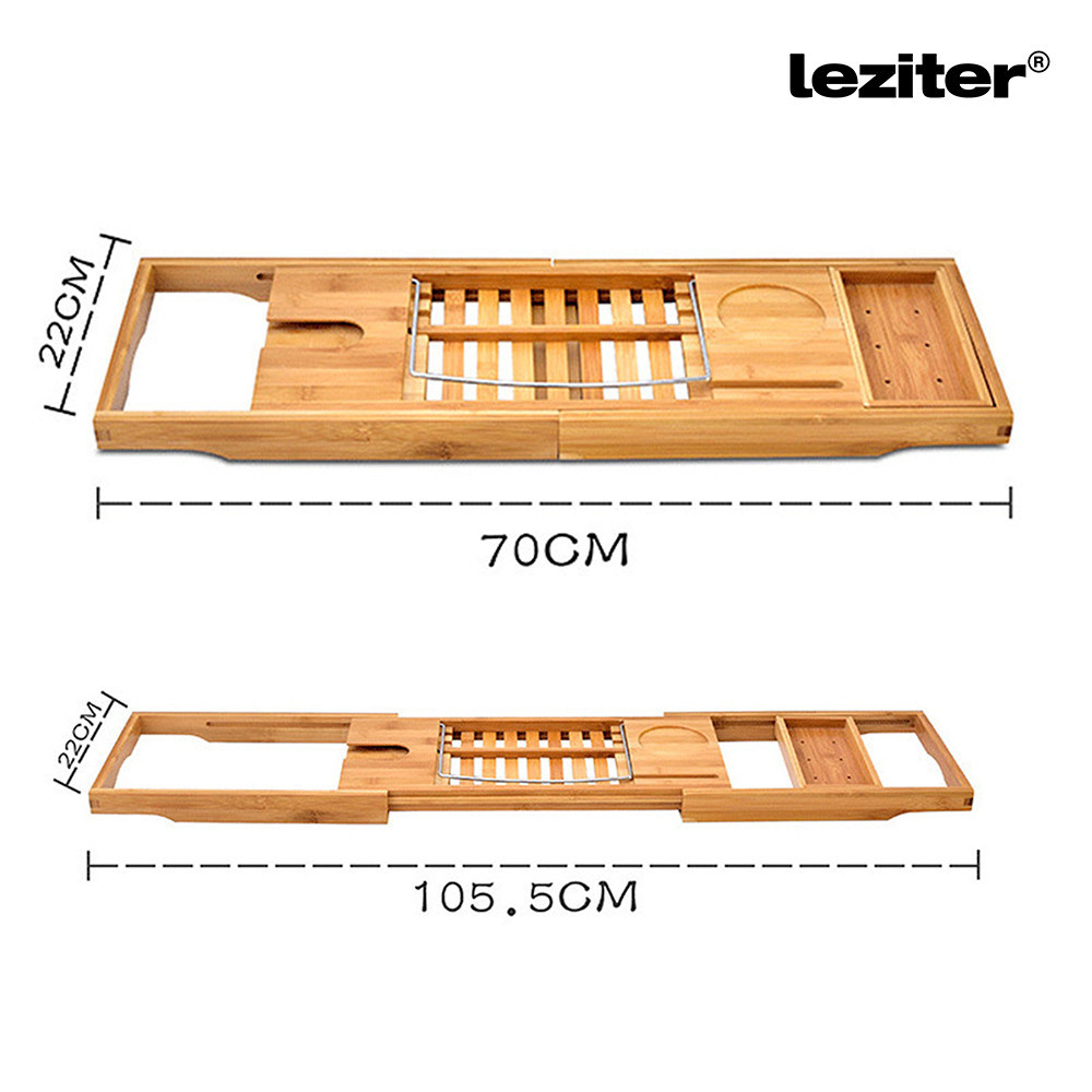 Tava reglabilă pentru cadă din bambus de la Leziter vă ajută să creați relaxarea perfectă. Suportul pentru tabletă și carte oferă o fixare stabilă, suportul pentru paharul de vin oferă un loc sigur, iar compartimentele separate pot găzdui și un telefon și alte obiecte mici .