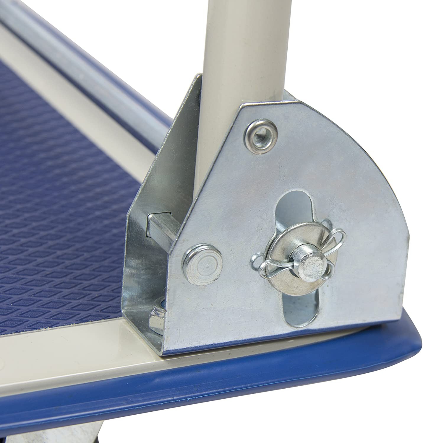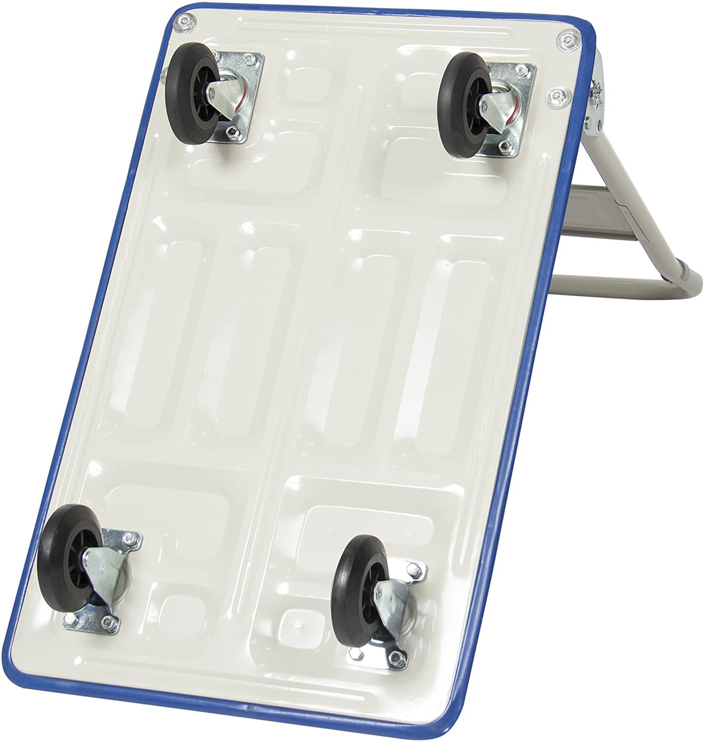 Este fabricat din otel, platforma antiderapanta si 2 roti pivotante, 2 fixe de calitate care permit manevrarea caruciorului la stanga, dreapta, inainte si inapoi fara probleme. Cand nu este folosit acesta poate fi depozitat si nu ocupa mult spatiu, bara de ghidare se pliaza in jos pentru economisirea spatiului si depozitarea in spatii compacte.