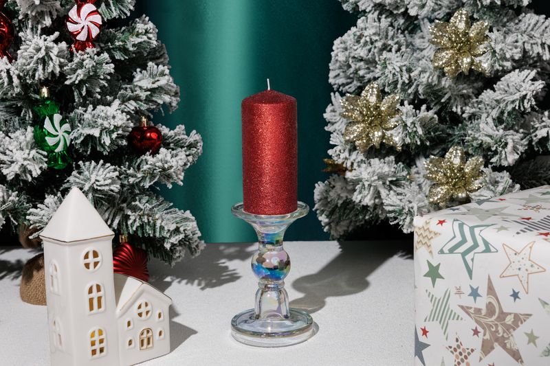 Aceasta lumanare rosie cu sclipici este potrivita atat pentru uz decorativ, cat si pentru completarea aranjamentelor sezoniere. Poate fi folosita individual sau in set, pe suporturi pentru lumanari, in decoruri de iarna, pe masa de sarbatoare sau in vitrine tematice.