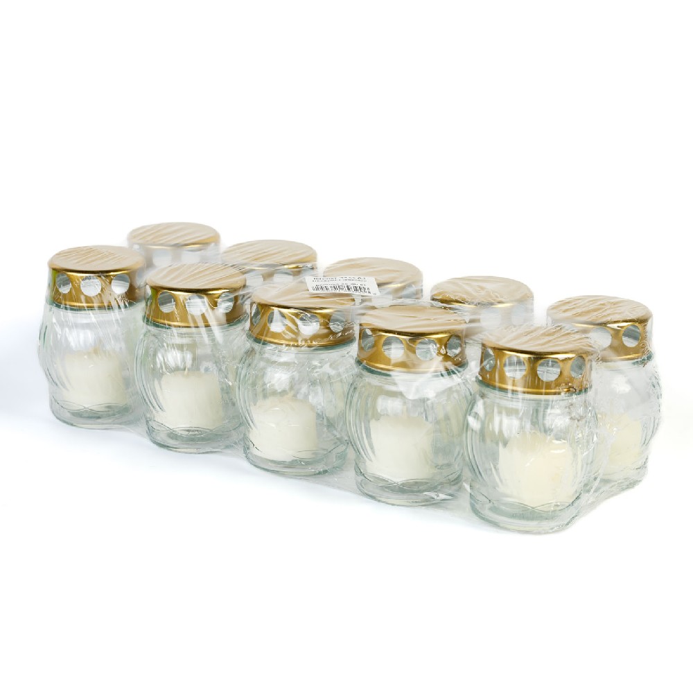 Această lumânare clasică din sticlă albă este o alegere potrivită pentru comemorări, sărbători religioase sau vizite la cimitir. Recipientul transparent din sticlă oferă un aspect elegant și sobru, iar capacul metalic auriu protejează flacăra și îi prelungește durata de ardere.