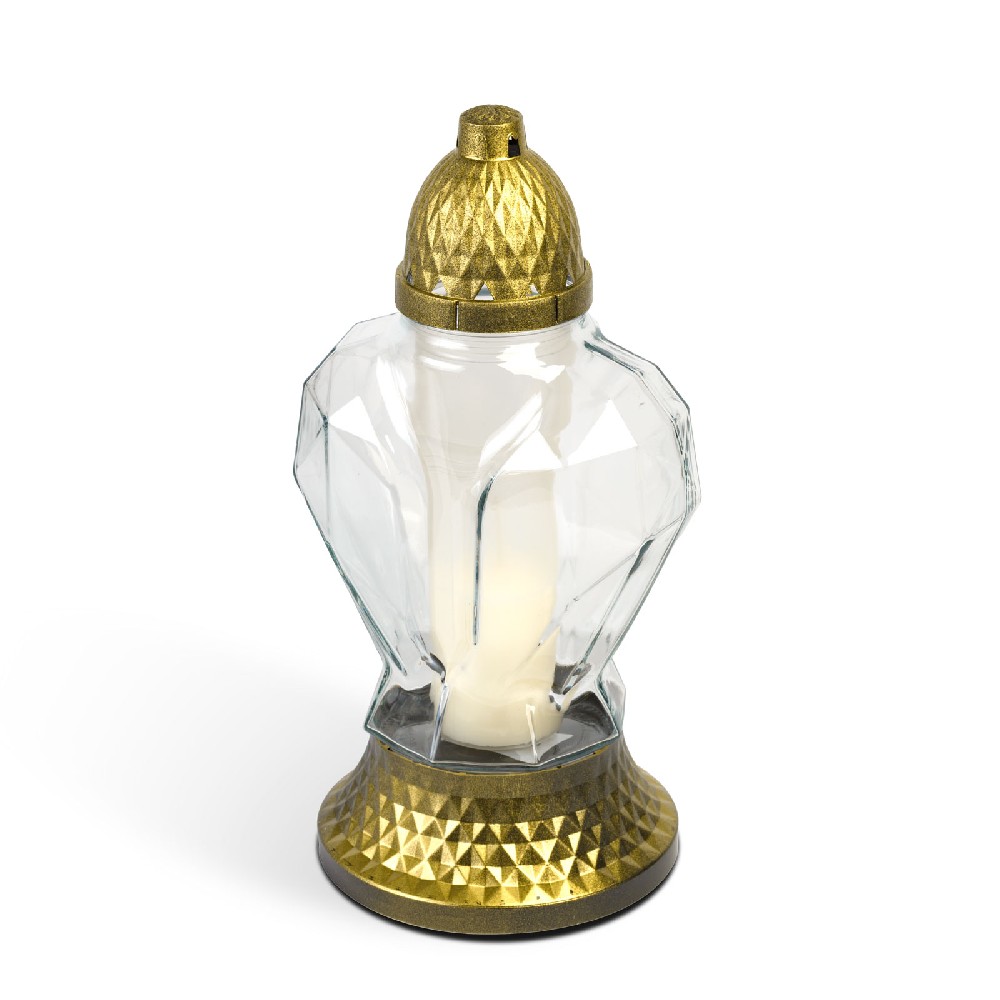Această lumânare clasică din sticlă este potrivită pentru momente de reculegere, comemorări sau vizite la cimitir. Recipientul transparent din sticlă oferă un aspect elegant, iar capacul decorativ negru cu reflexii aurii antichizate protejează flacăra și adaugă un plus de rafinament.
